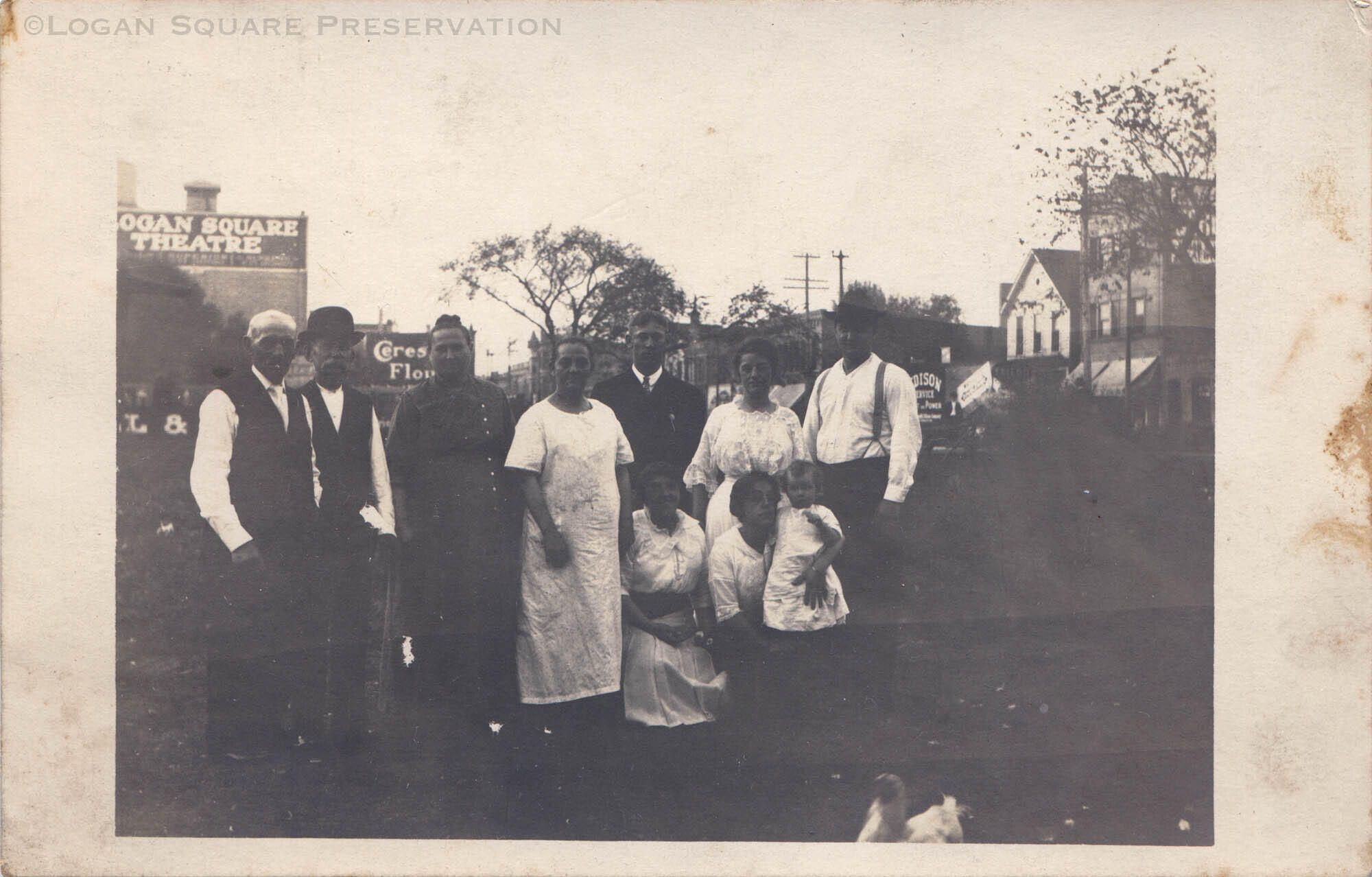 Real-photo postcard view of unknown (possibly Eichmann?) family and chicken standing on open lot at roughly 2470 N. Milwaukee Ave with advertisements for Logan Square Theatre, Ceresota Flour, Edison Service, Wrigley gum in distance, circa 1913-1917Subject Place