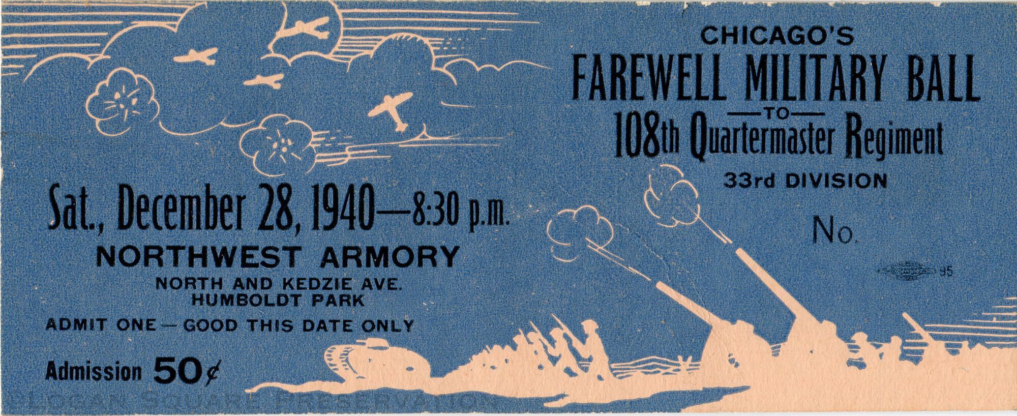 50¢ admission ticket to Dec 28, 1940 Farewell Military Ball for 108th Quartermaster Regiment, 33rd Division, at Northwest ArmoryPublication Details