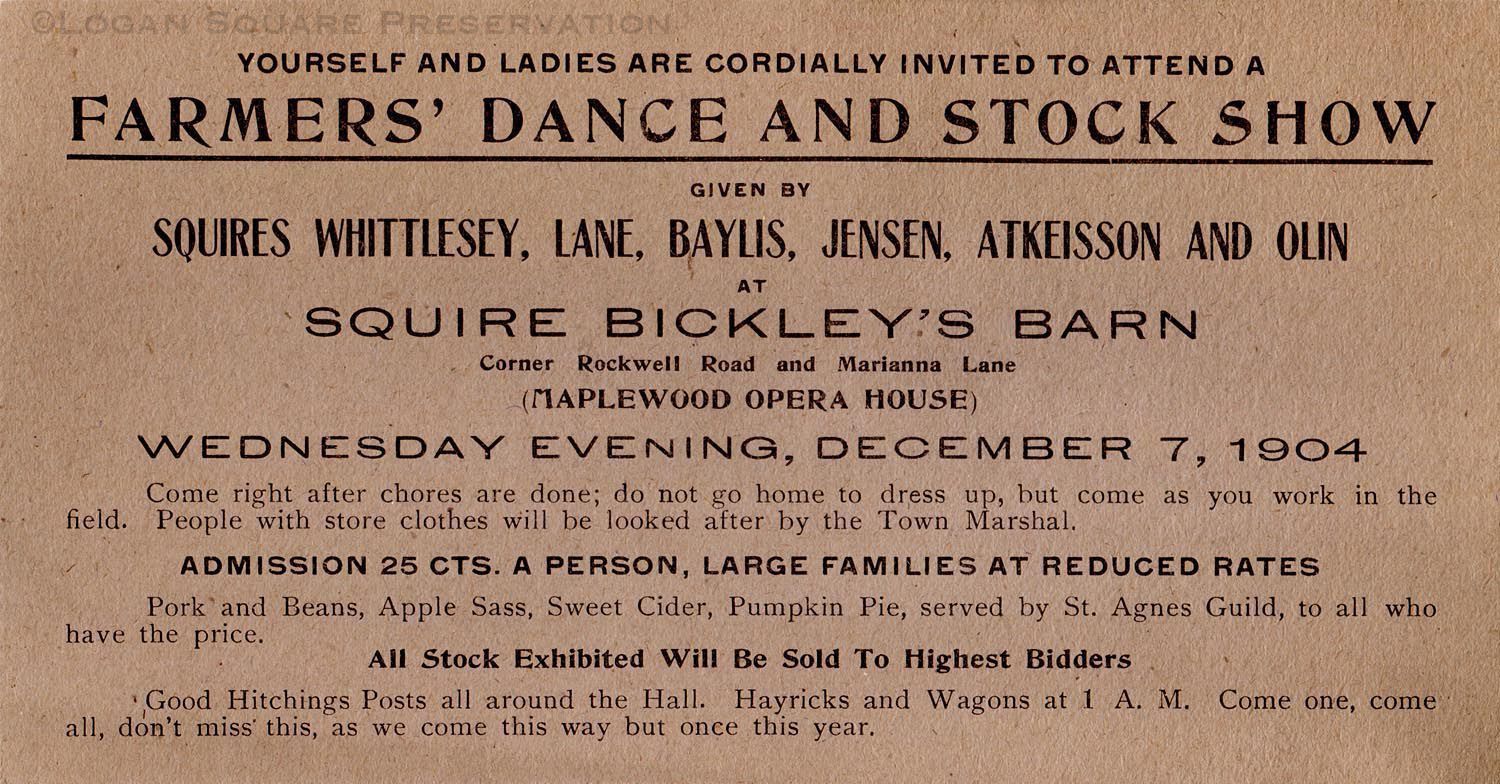 Invitation card to country-themed dance at Maplewood Opera House sponsored by Church of the Advent members with food served by St. Agnes Guild, held December 7, 1904