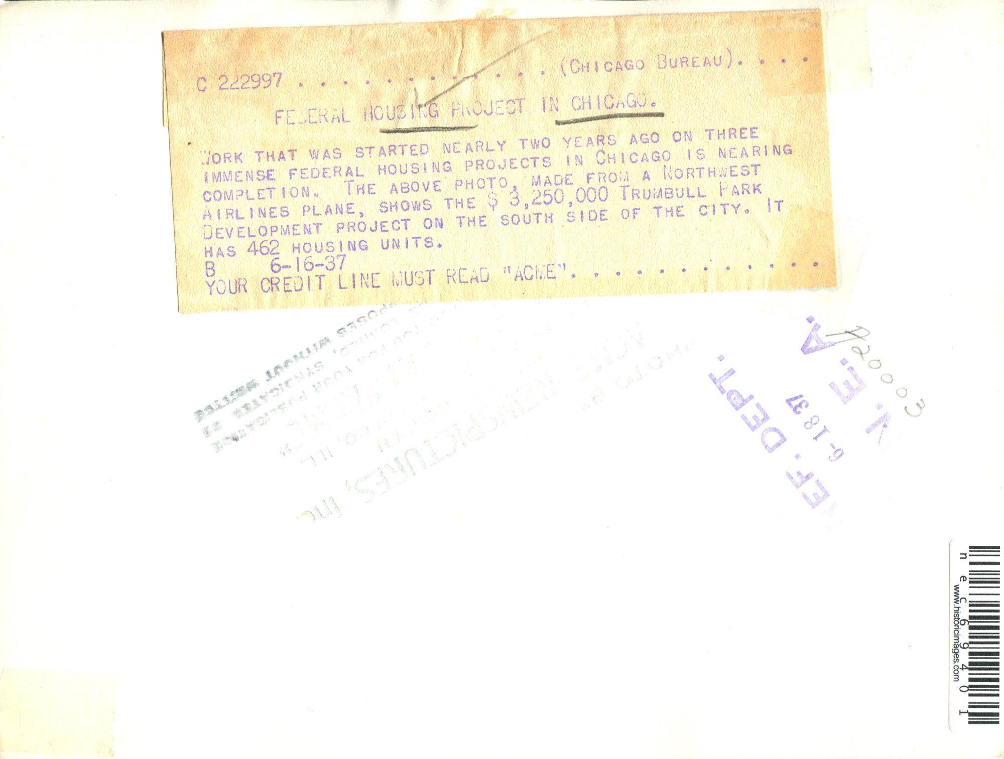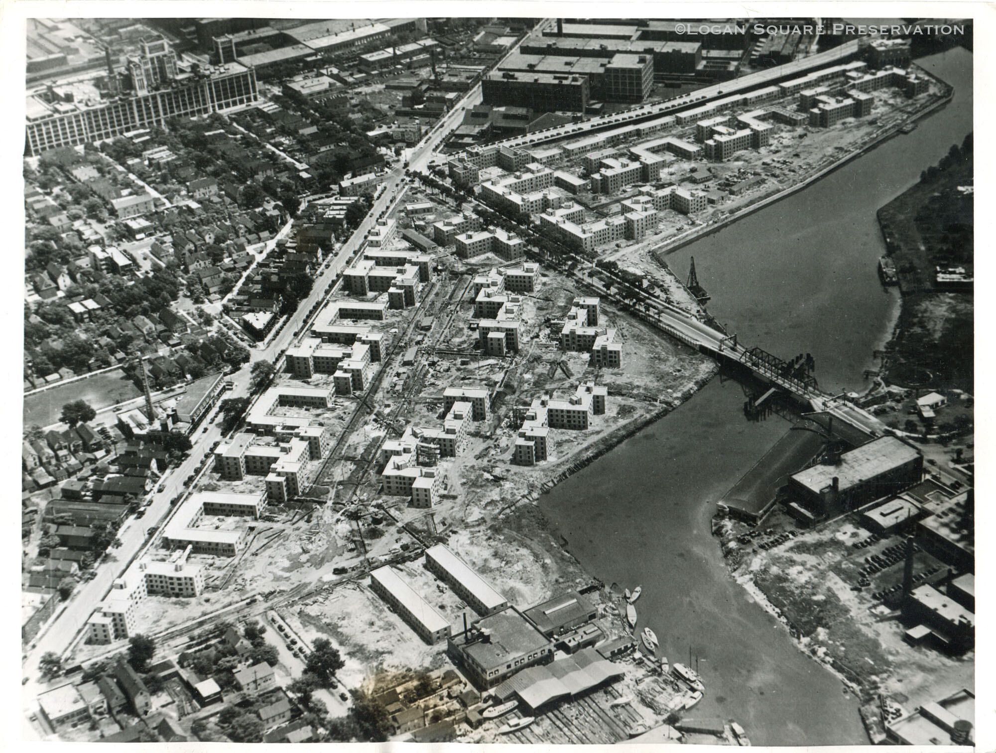 News photo aerial view of Lathrop Homes public housing under construction at Fullerton & Chicago River, taken Jun 16, 1937Photograph Details