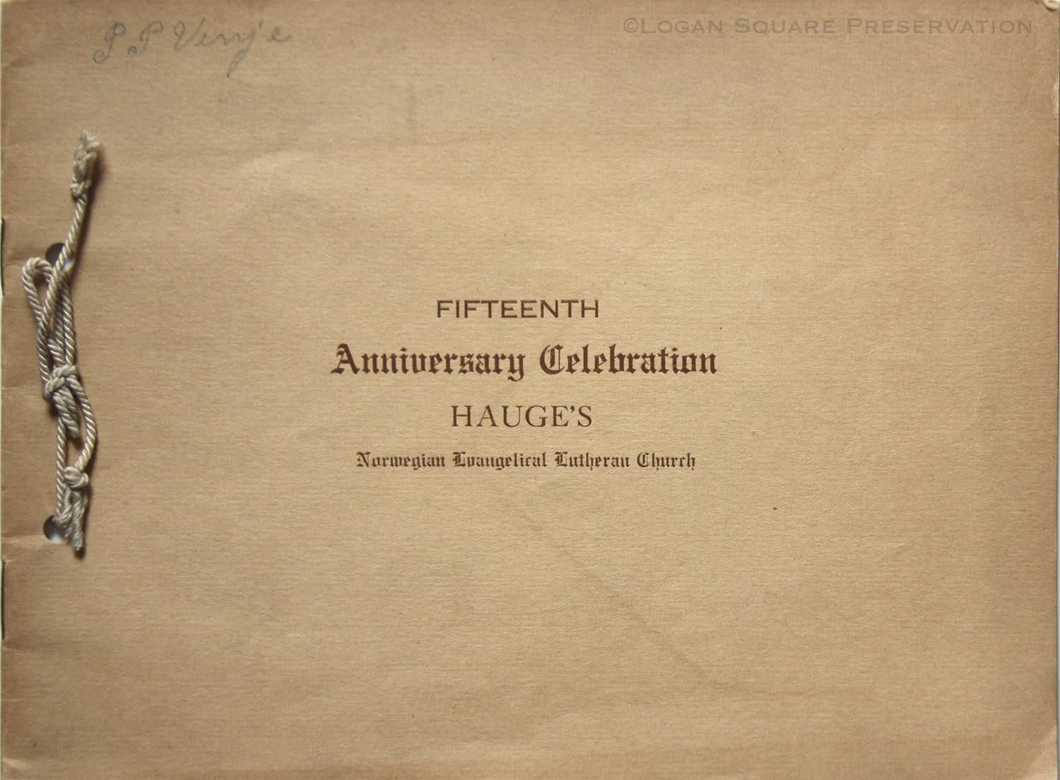 32-pg souvenir booklet from Sept 1915 15th anniversary celebration of Hauge Lutheran founding in Norwegian and English signed by church member Peder P. Vinje. Includes church history, photos of pastors and church groups, member directory, local business adsPublication Details