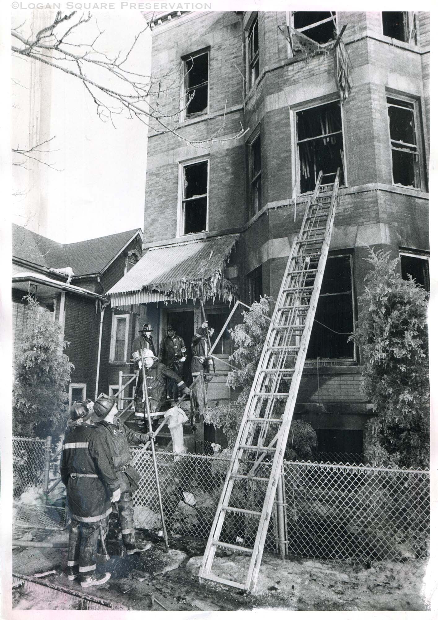 News photo of firemen looking at broken windows and melted awning in aftermath of fatal house fire in brick 3-flat on Feb 27, 1978Photograph Details