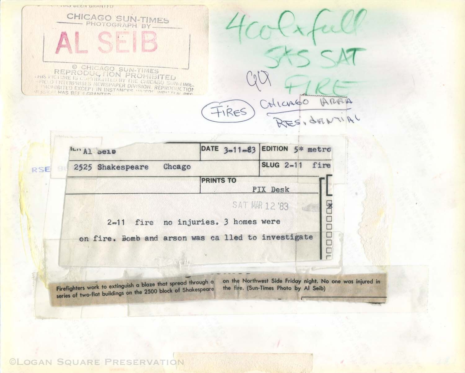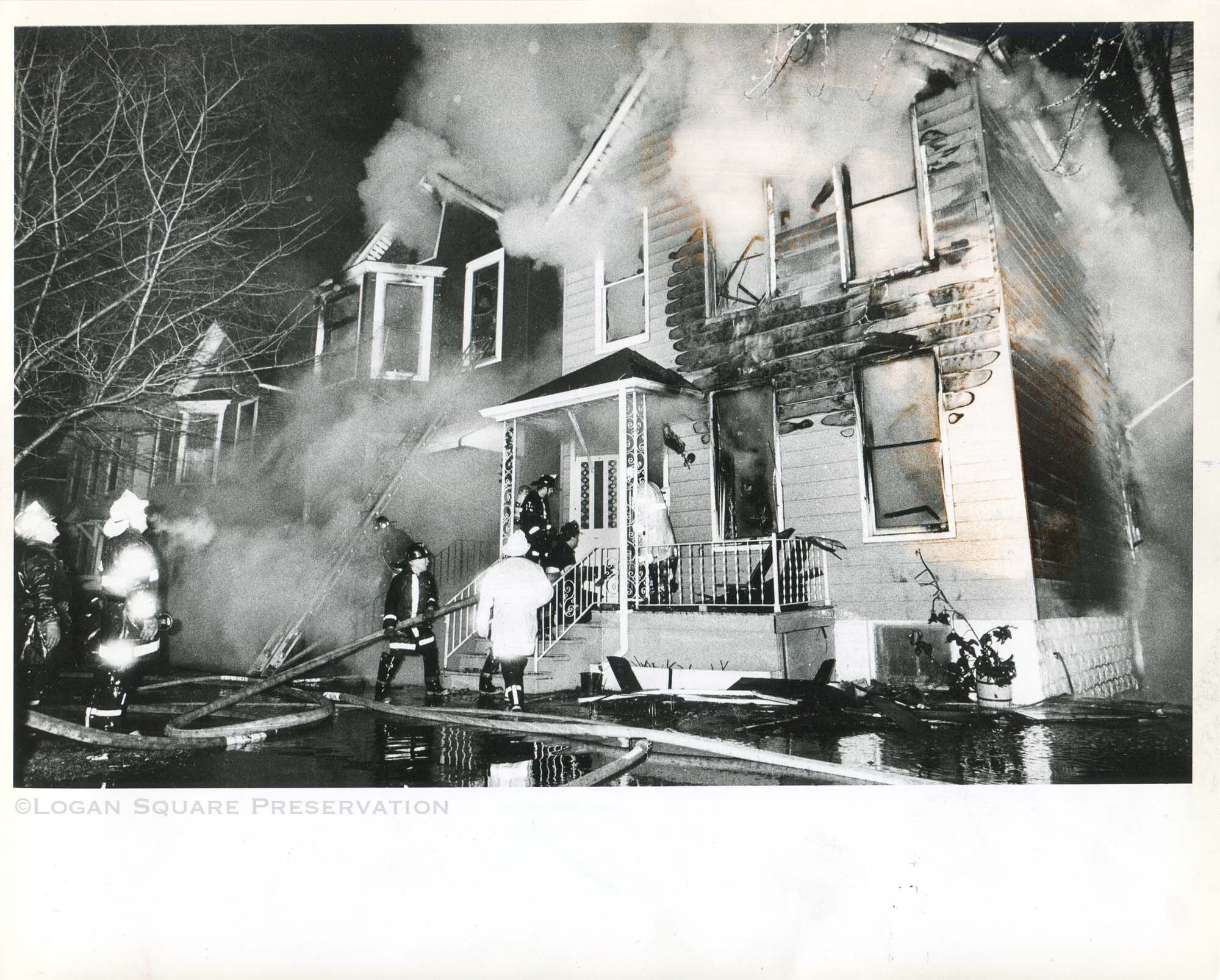 News photo of firemen pulling hoses to front door of smoke-filled two-flats at 2531 & 2529 W. Shakespeare on winter night, March 1983Photograph Details