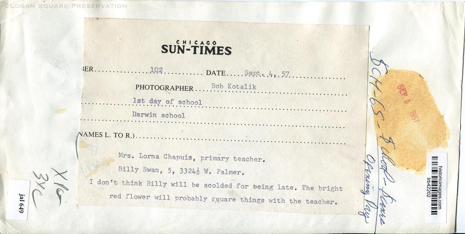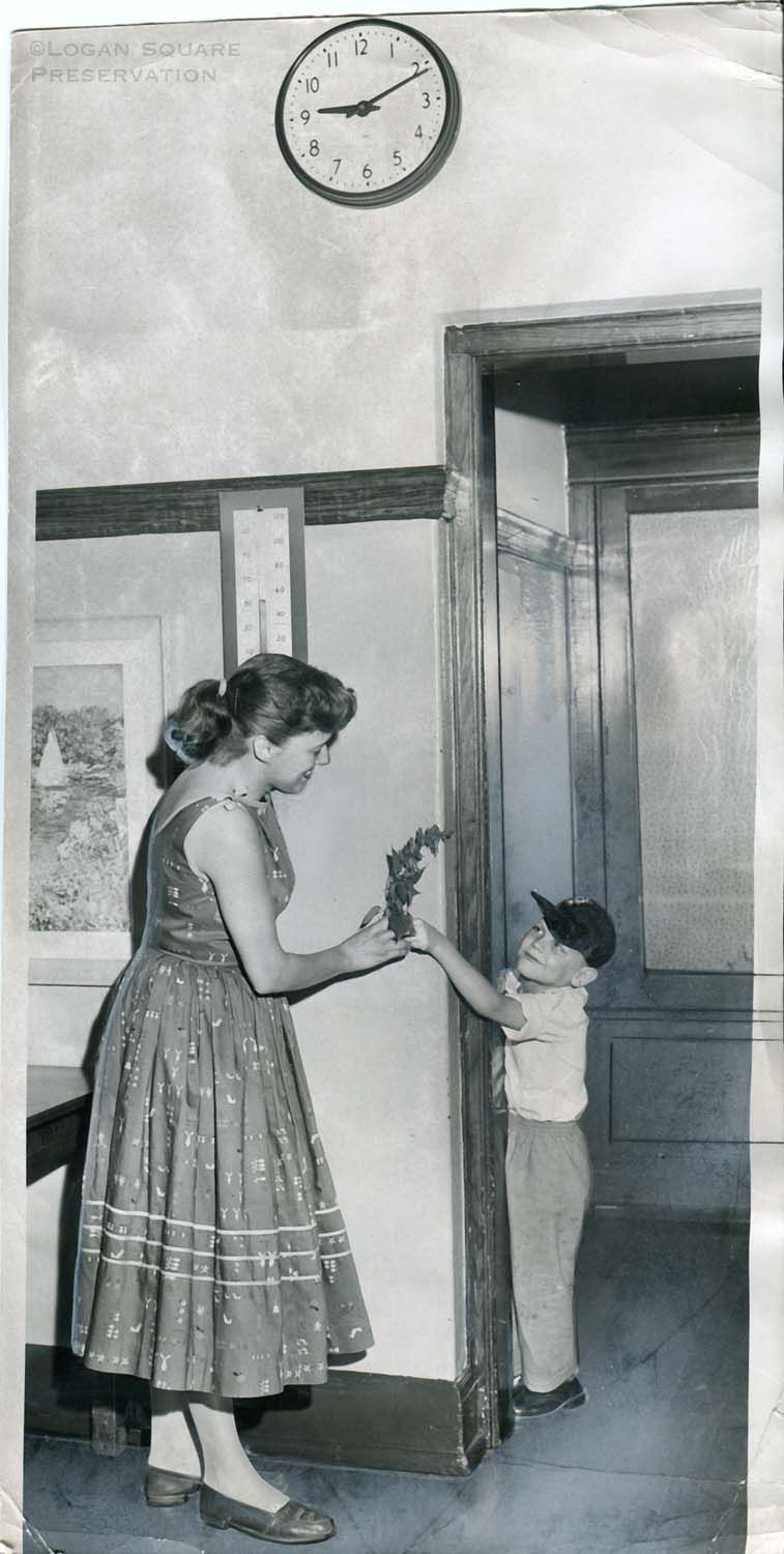 New photo of kindergartner Billy Swan, late to school on first day, giving teacher Lorna Chapuis a flower from classroom doorway, 1957Photograph Details