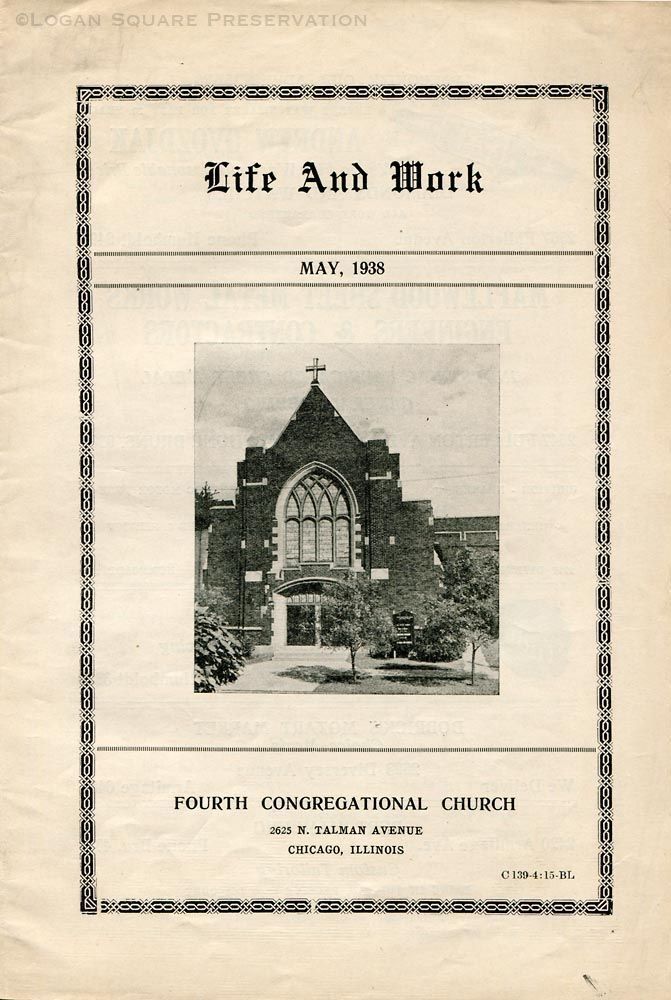 16-pg newsletter with photo of front of Fourth Congregational Church building on cover, May 1938. Contains church news and local business ads.Collection