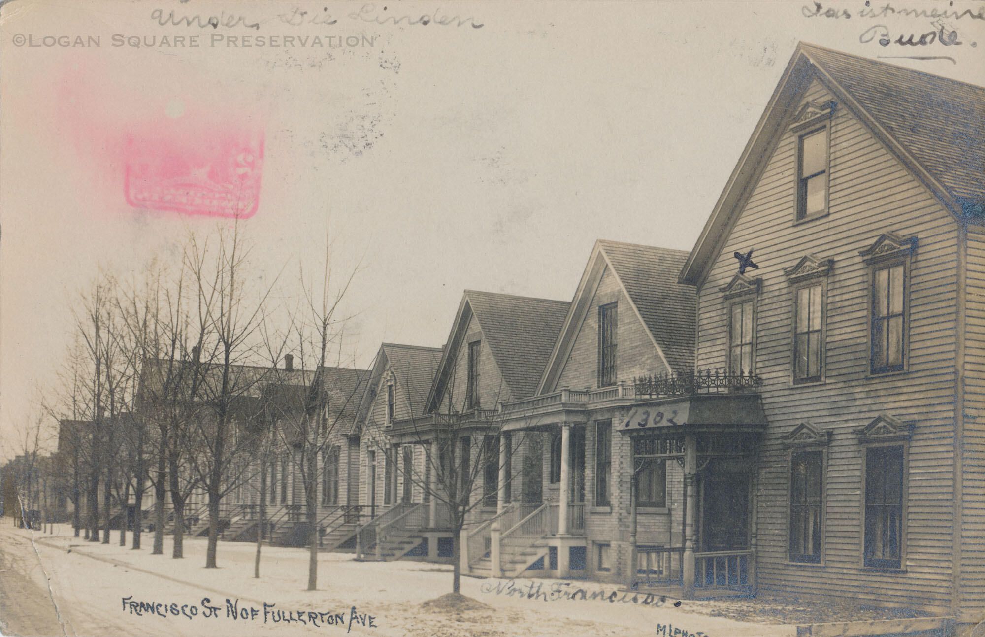 Real-photo postcard view of frame house and workers cottages on 2401 block of N. Francisco Ave, circa 1909. House on the right 2413 (1302 Francisco pre-1909) is marked with an X and note: "Das ist meine Buhle [?]."Subject