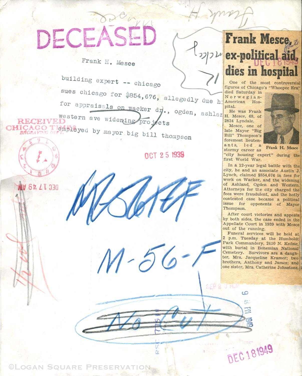 News photo portrait of Frank Mesce, controversial building assessor who sued the city for promised 2% of condemned building values during widening of Western, Ashland, Ogden and other streets in 1919 under Mayor Bill ThompsonPhotograph Details