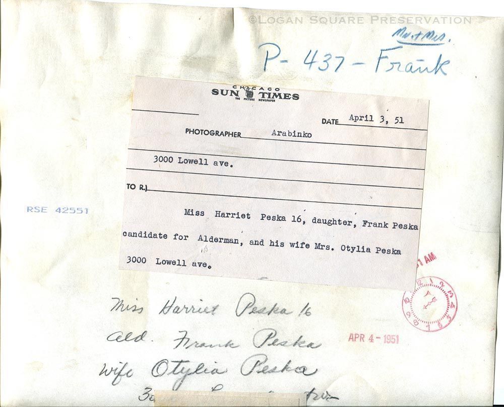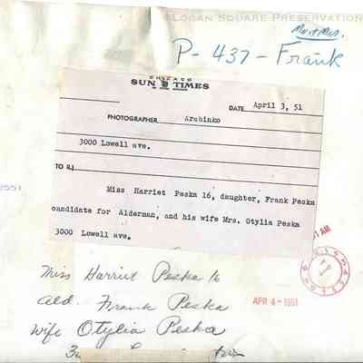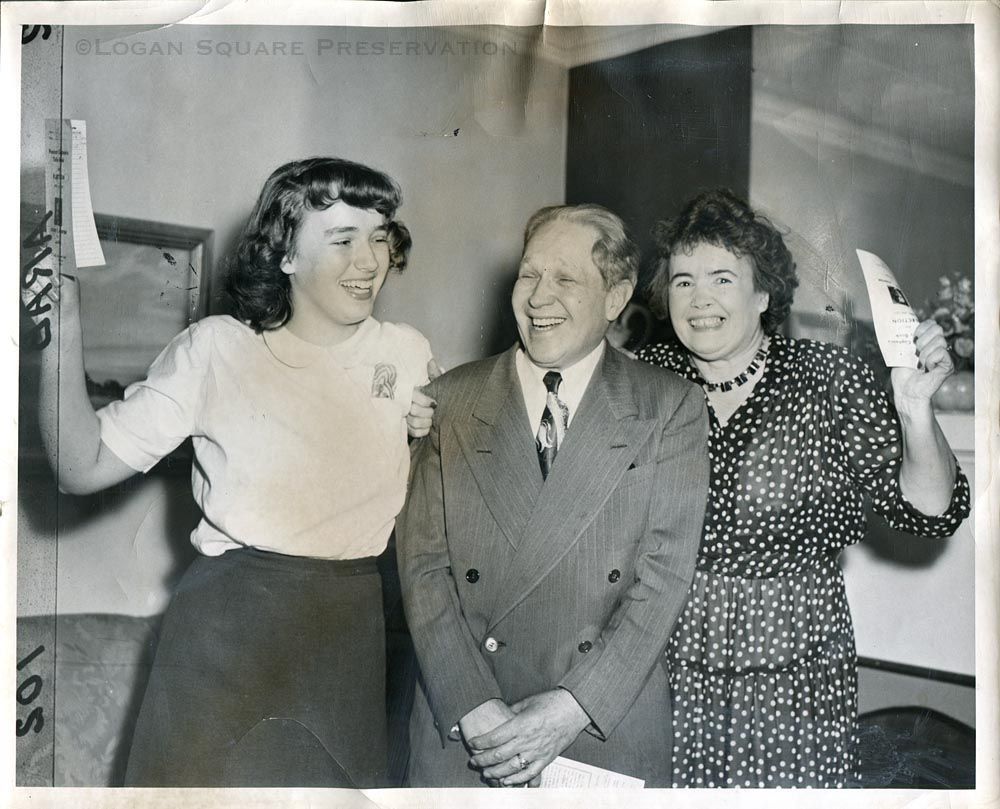 News photo of Republican candidate Frank Peska smiling with daughter Harriet and wife Otylia Peska after winning run-off election for 35th Ward Alderman, 1951Photograph Details