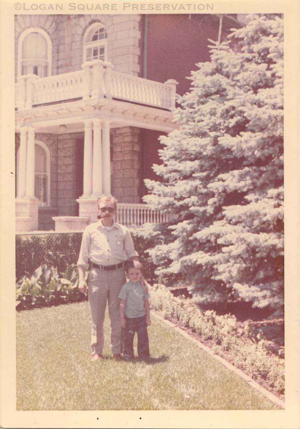 Snapshot photo of Gregory Heratschenko and boy standing near spruce trees in front yard of house at 2234 N. Kedzie with porch of house next door at 2228 N. Kedzie behind fence in background, circa 1970s.Photograph Details
