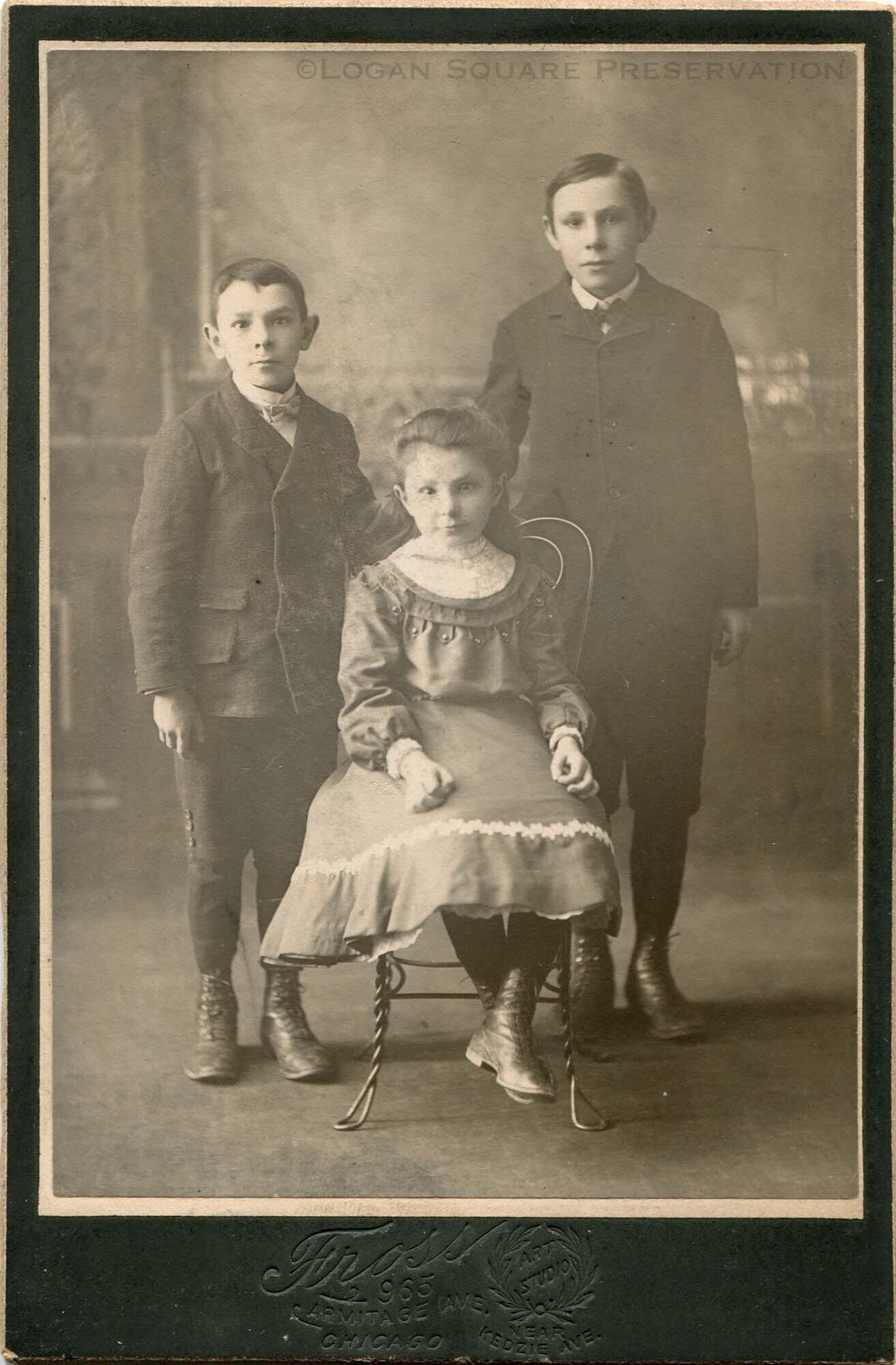 Cabinet card studio portrait of unidentified girl sitting in wire chair with two boys standing behind, circa 1900-1909Photograph Details