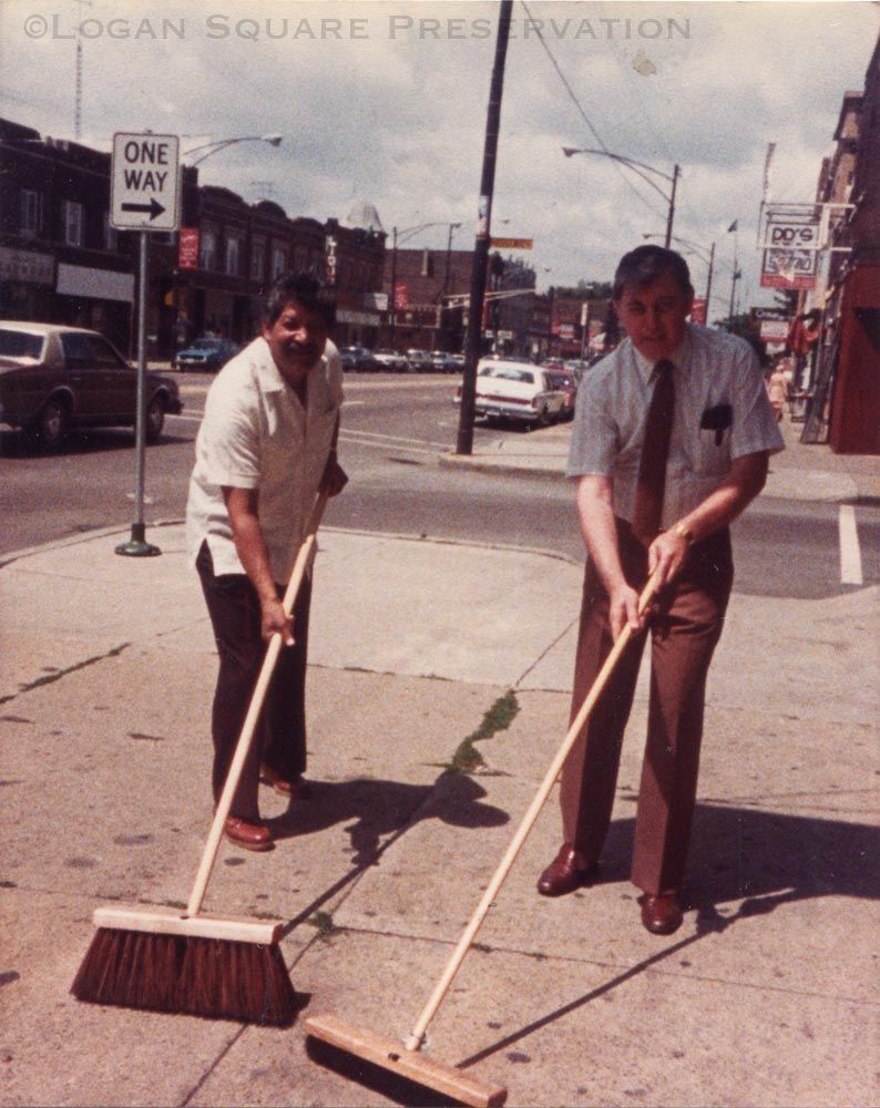 Cropped snapshot photo of two men with push brooms cleaning sidewalk at corner of Ridgeway & Fullerton Aves, 1984