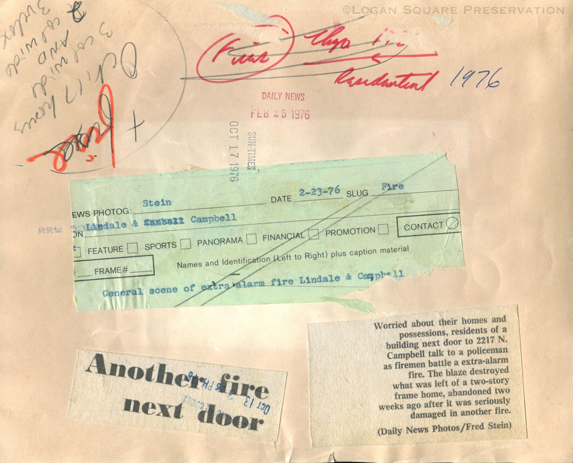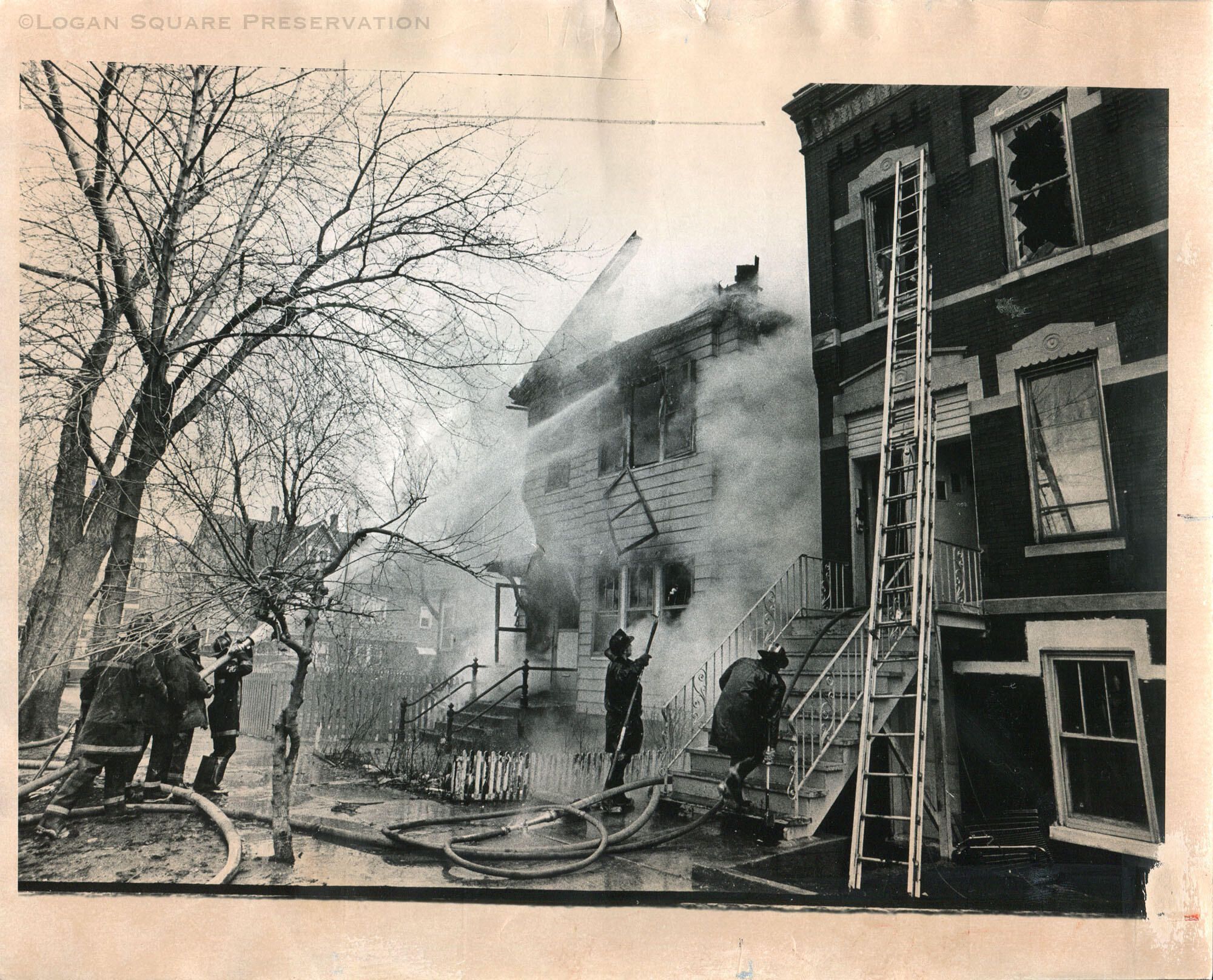 News photo view of firemen directing water at smoldering frame 2-flat which had been damaged previously in fire two weeks earlier. Ladder to top floor of brick 2-flat next door with broken windows. Feb 1976Photograph Details