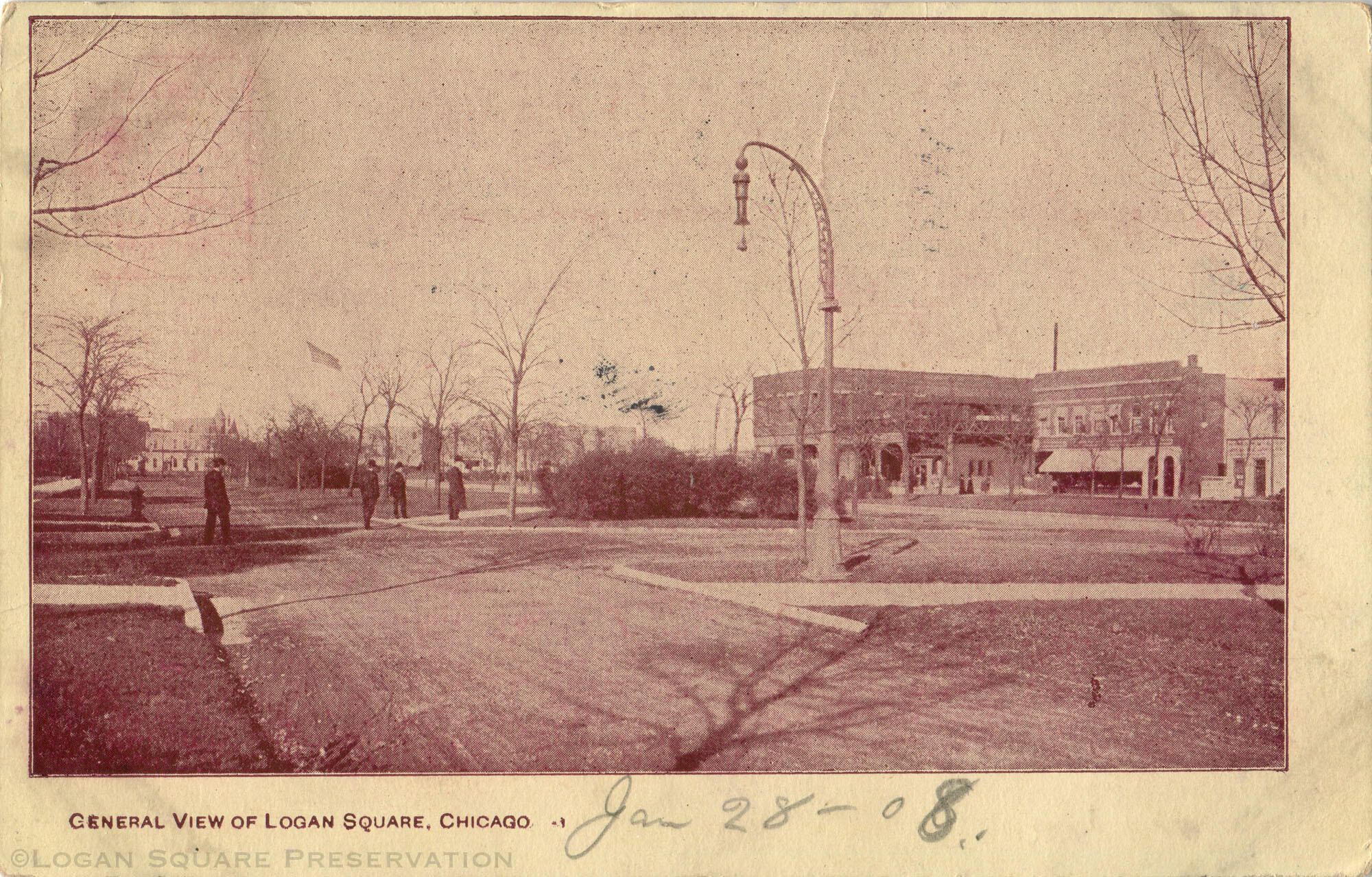 Printed postcard view looking north on Kedzie Boulevard toward Logan Square flagpole and Logan Square L Terminal, 1908Subject Place