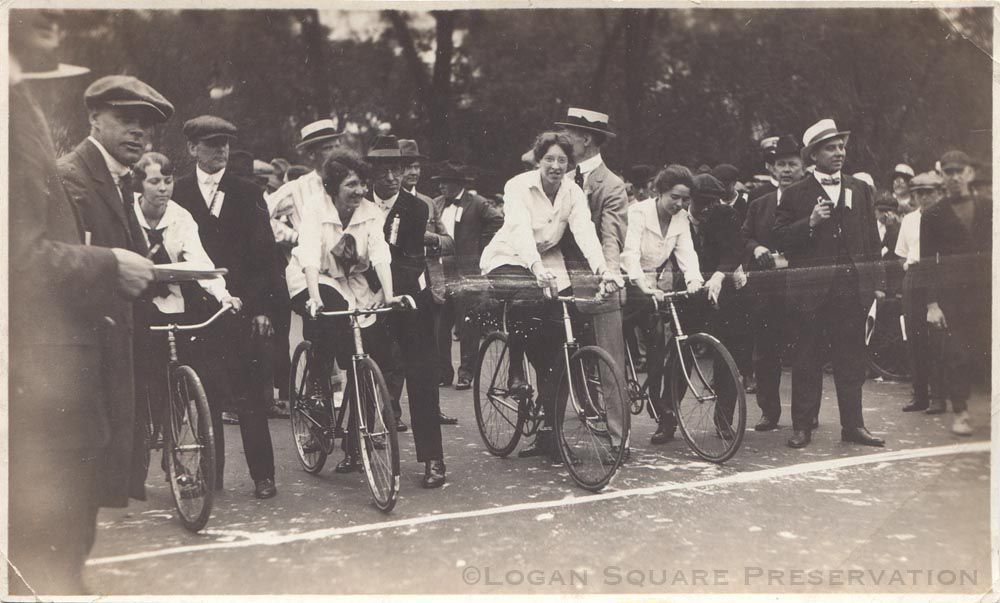 Snapshot photo of Viola Engstrom, Mamie McNulty, Clara Hibbeler and another woman cyclist held in position by race officials at starting line of 2-mile Labor Day bicycle race in Humboldt Park sponsored by Franklin Skating & Bicycle Club, 1918Photograph Details