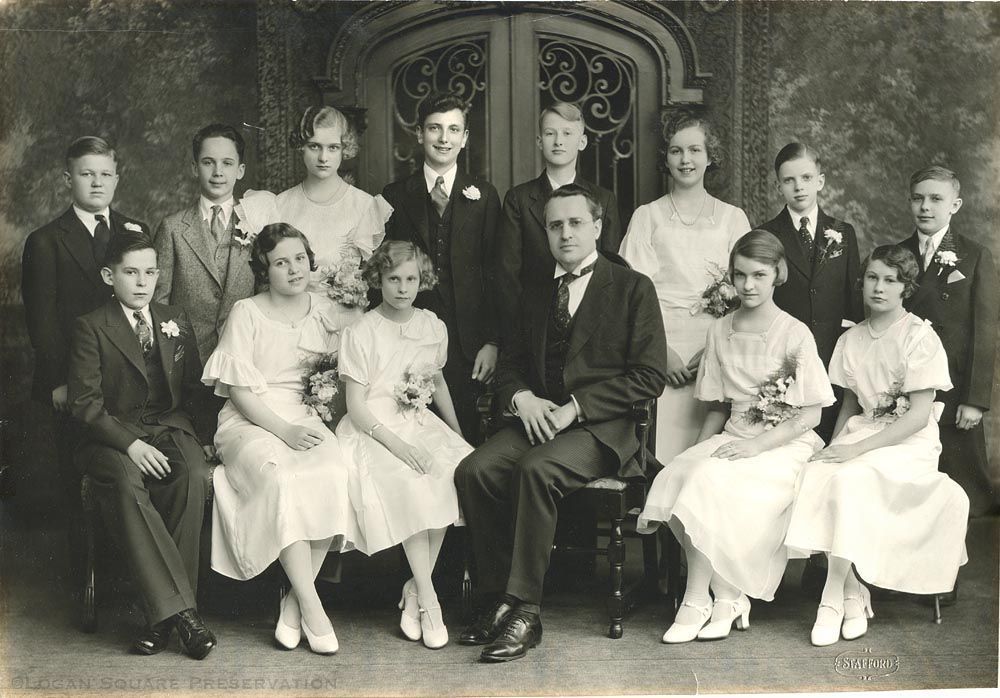 Studio portrait of Grace Church pastor Irvin Schweitzer seated at center of group of confirmands, circa 1930sPhotograph Details