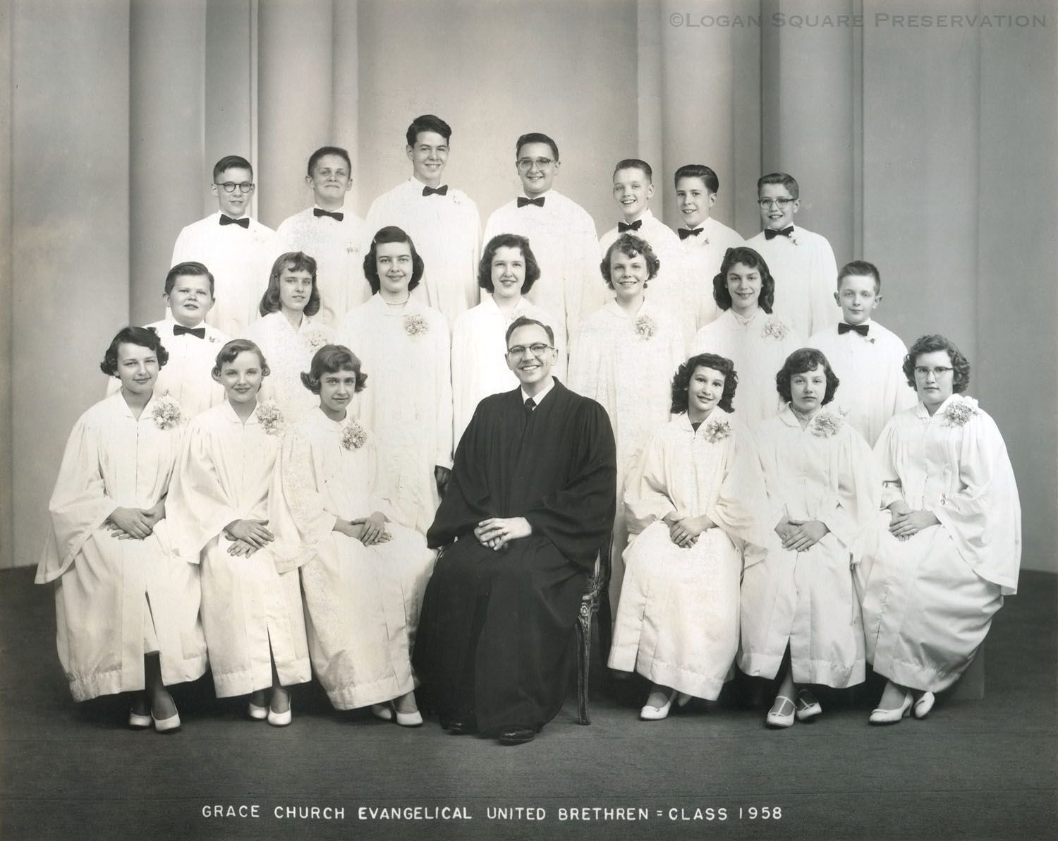 Studio portrait of Grace Church pastor Francis Guither at center of group of confirmands in white robes. Photo mounted on cardboard mat, 1958Photograph Details