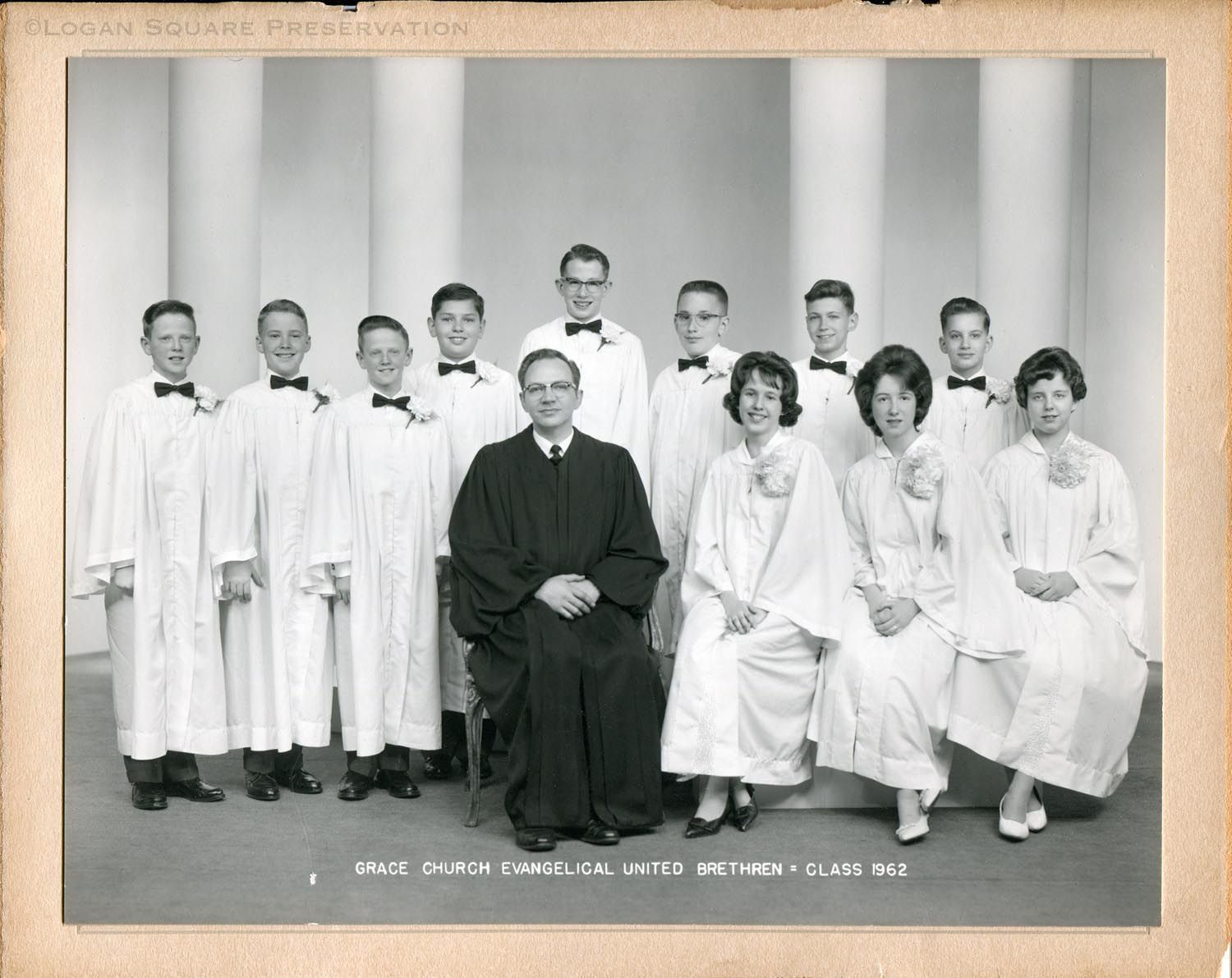 Studio portrait of Grace Church pastor Francis Guither at center of group of confirmands in white robes, identified by Vicki Logan as: Tim Forest, Geoffrey Guither, Terry Forest, Roger Kalinowski, Dennis Wolf, Donald Wolf, Dwayne Logan, Donald Craddock, Bonnie Wojton, Roberta Shorr. Photo mounted on cardboard mat, 1962Photograph Details