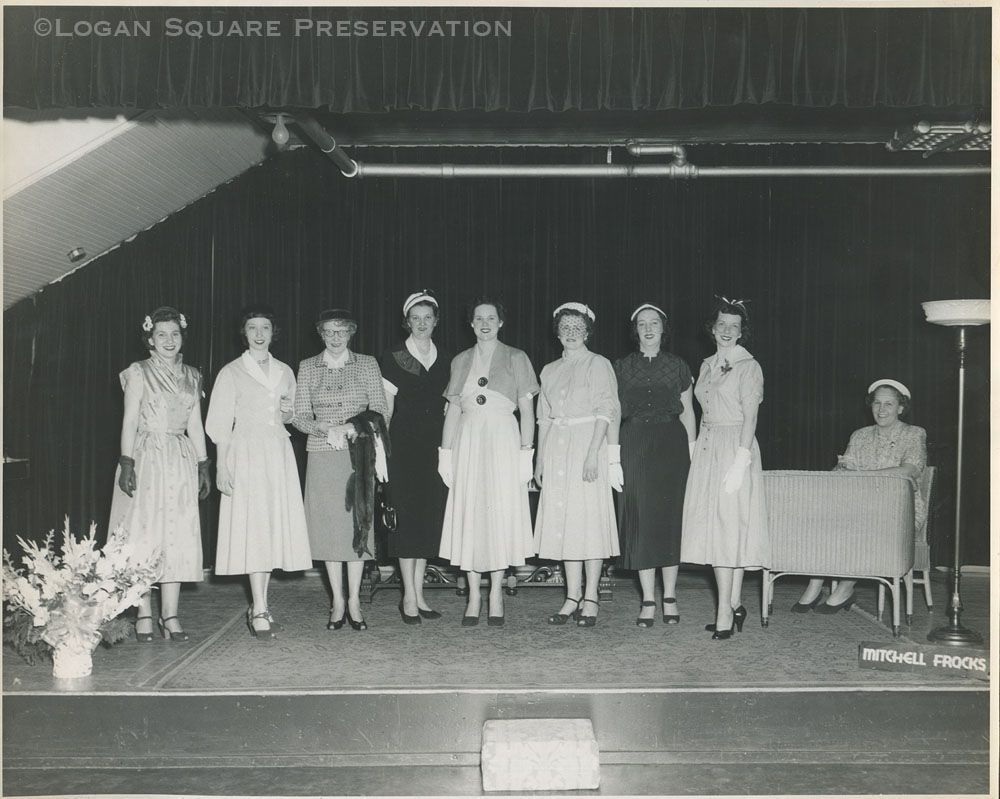 Group photo of women on stage participating in Christian Service Guild spring fashion show fundraiser for missions projects sponsored by Mitchell Frocks clothing store, March 1953Photograph Details