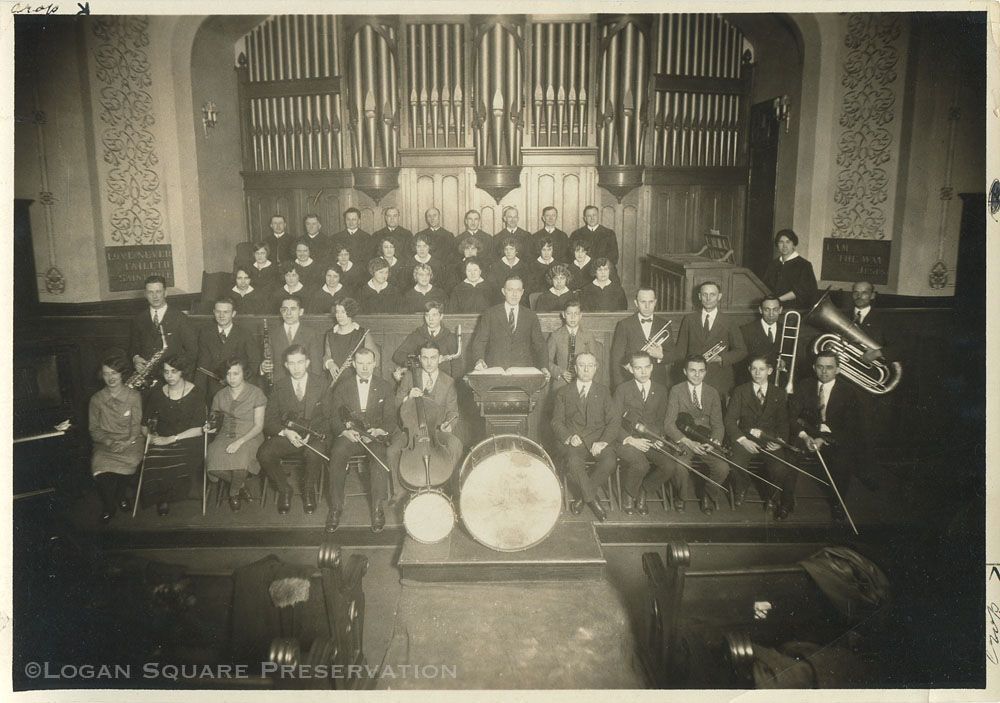 Group portrait of seated members of orchestra holding string, wind and brass instruments, along with seated choir and organist gathered behind pastor at lectern behind bass drum, in Grace Church chancel with organ pipes on back wall, circa early 1930sPhotograph Details