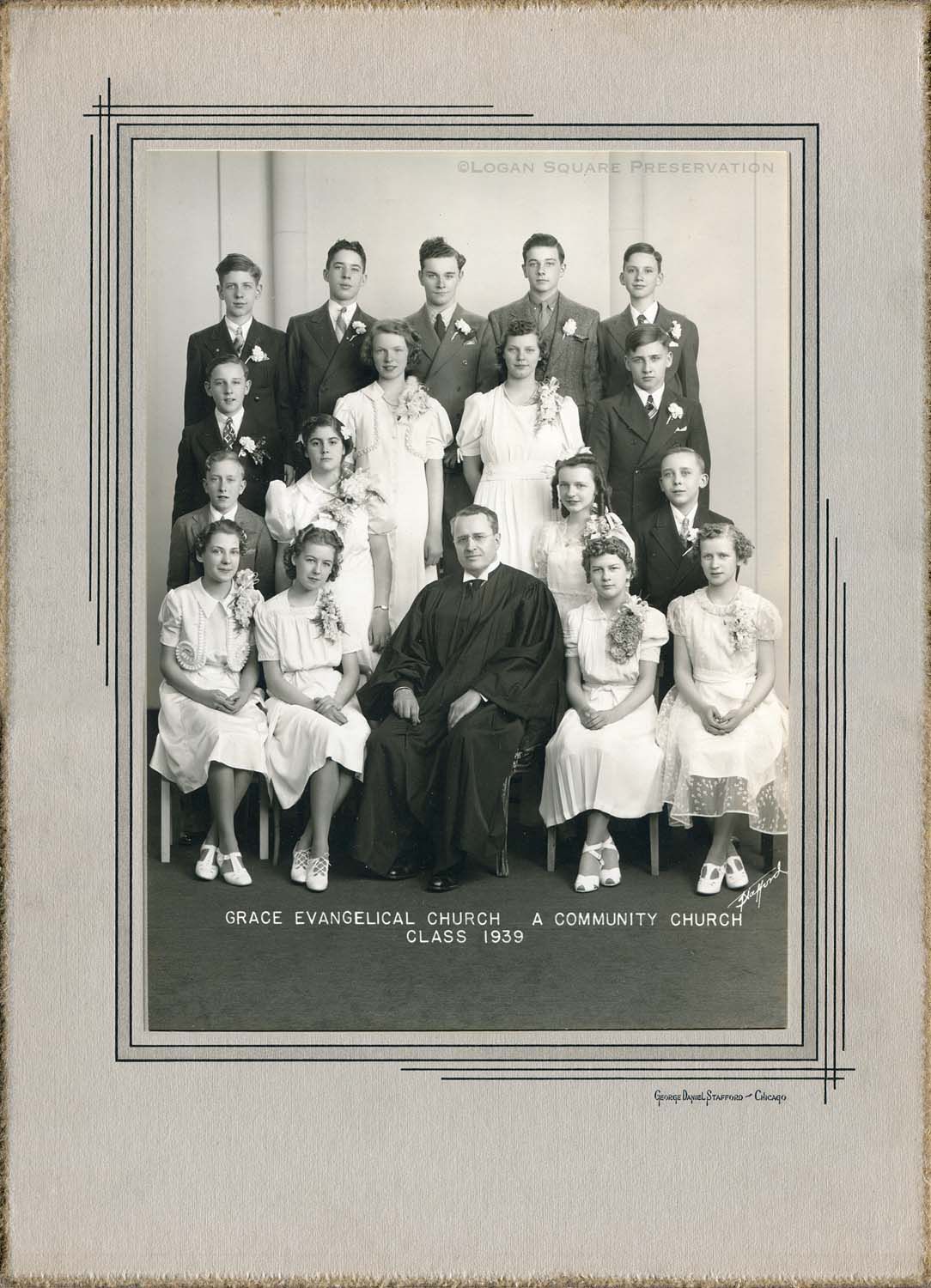 Studio portrait of Grace Church pastor Irvin Schweitzer at center of group of confirmands. Photo mounted on cardboard folder, 1939Photograph Details