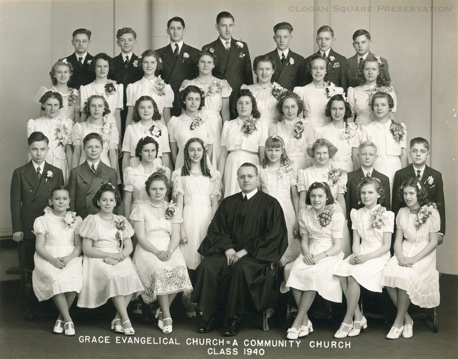 Studio portrait of Grace Church pastor Irvin Schweitzer at center of group of confirmands. Photo mounted on cardboard folder, 1940Photograph Details