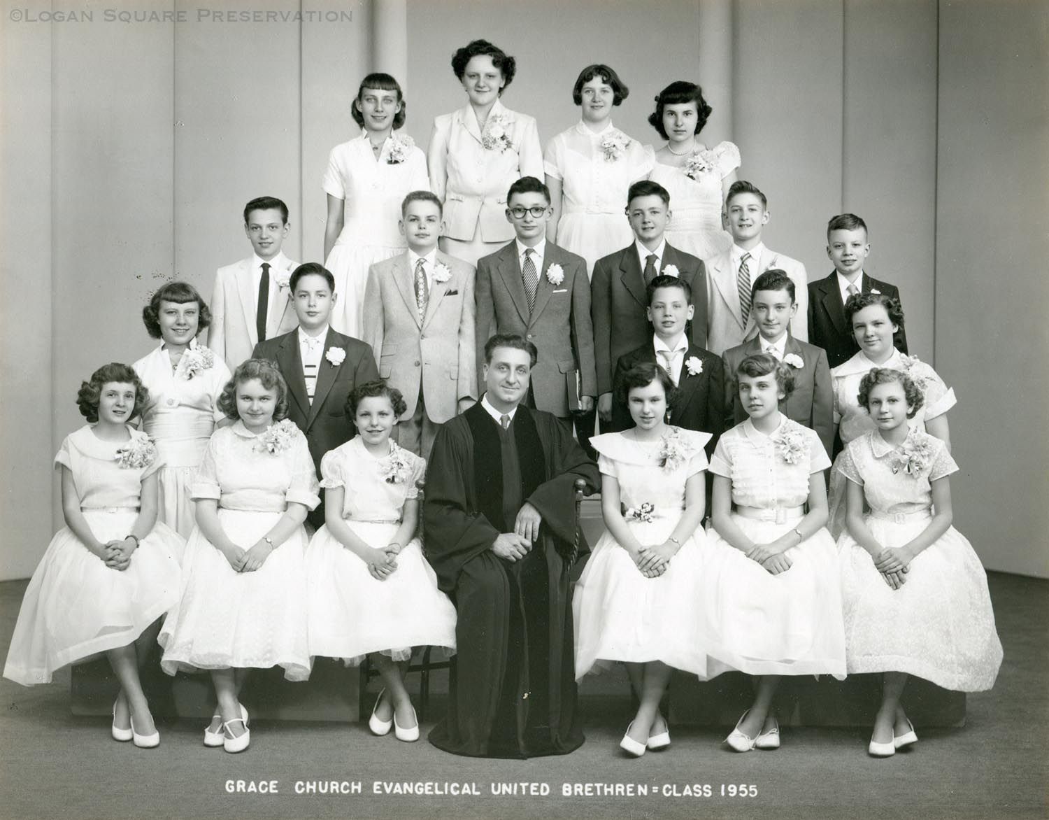 Studio portrait of Grace Church pastor Edward Henninger at center of group of confirmands on risers. Mounted on cardboard folder, 1955Photograph Details