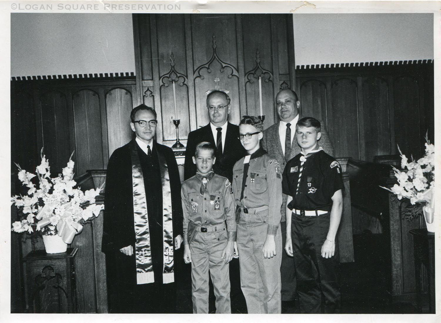 Snapshot portrait of Reverend Francis G. Guither standing in Grace Church chancel with three boys in scout uniforms and adult scout leaders, some identified by Vicki Logan as Mr. Williamson and Geoffrey Guither, circa 1960sPhotograph Details