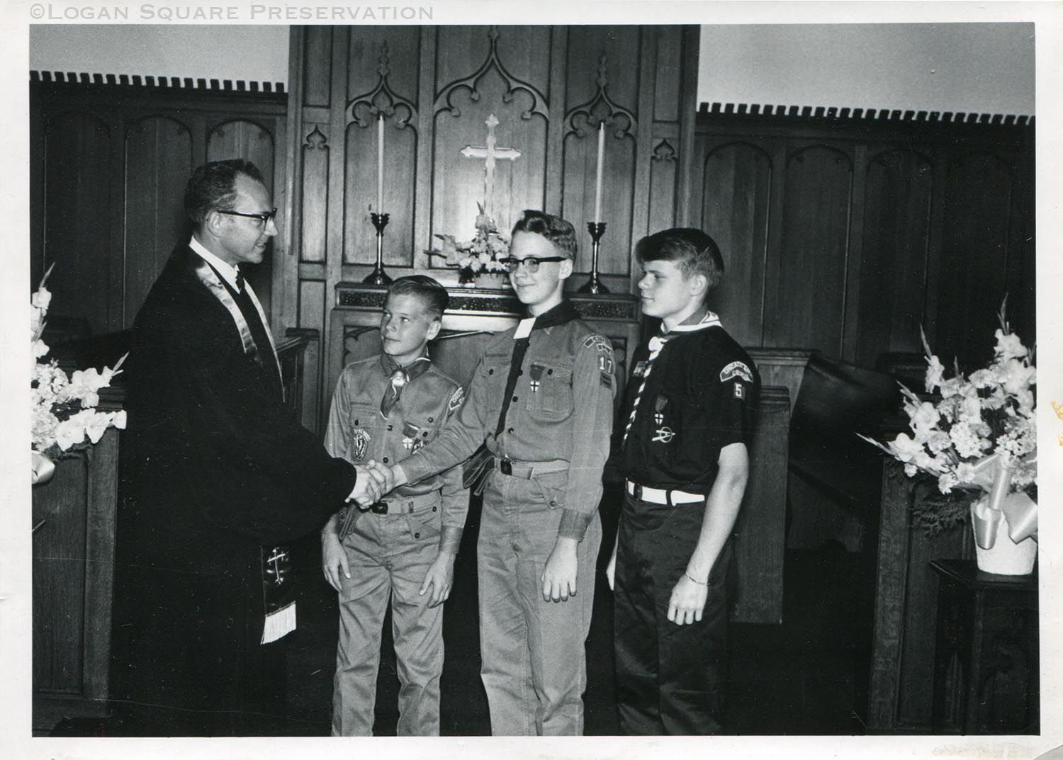 Snapshot photo of Geoffrey Guither and two other boys in scout uniforms shaking hands with Reverend Francis G. Guither, circa 1960sPhotograph Details