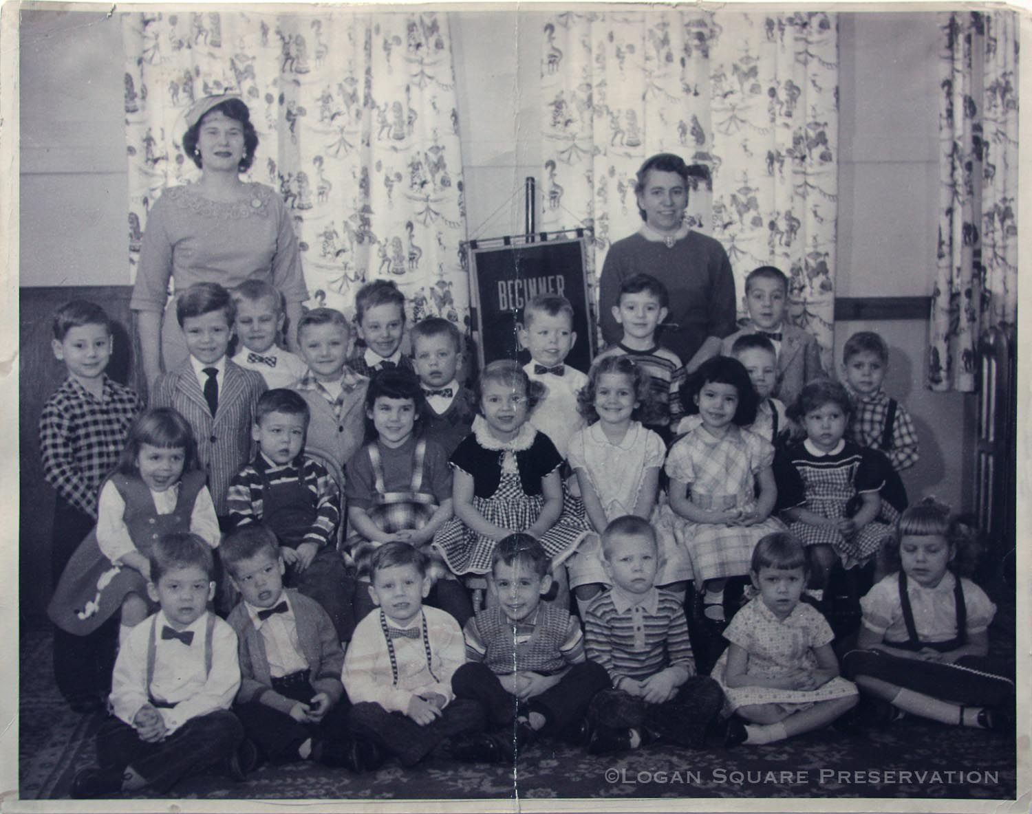 Sunday School class portrait identified by Vicki Logan as teachers Shirley Lesher and Marion Edwards, with students Philip Lesher, Keith Bauman, Deborah Heinrich, Peter Guither, Andrew Heinrich, Pamela Bauman and others in front of Beginner Class banner, circa late 1950sPhotograph Details