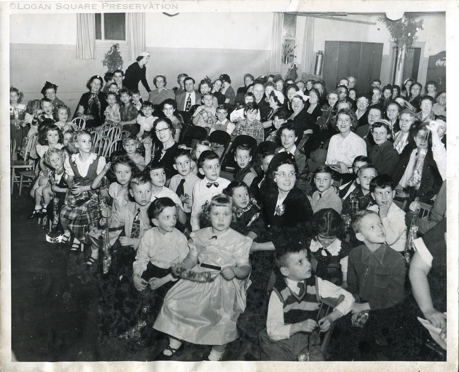 Snapshot view of audience of children holding candy stockings and parents sitting in chairs in Grace Church basement, including children identified by Vicki Logan as Joyce Weith and Jolyn Hansen, circa 1950sPhotograph Details