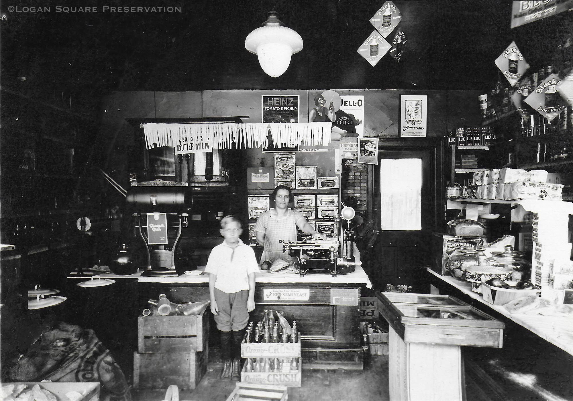 Photo of Teofila Jarek and son in family grocery store at 2347 W. McLean Ave (formerly Carver St) surrounded by crates of empty soda pop bottles, shelves of Butternut bread, and hanging signs for Blackene stove polish, Heinz ketchup and Jell-o, circa 1922Photograph Details