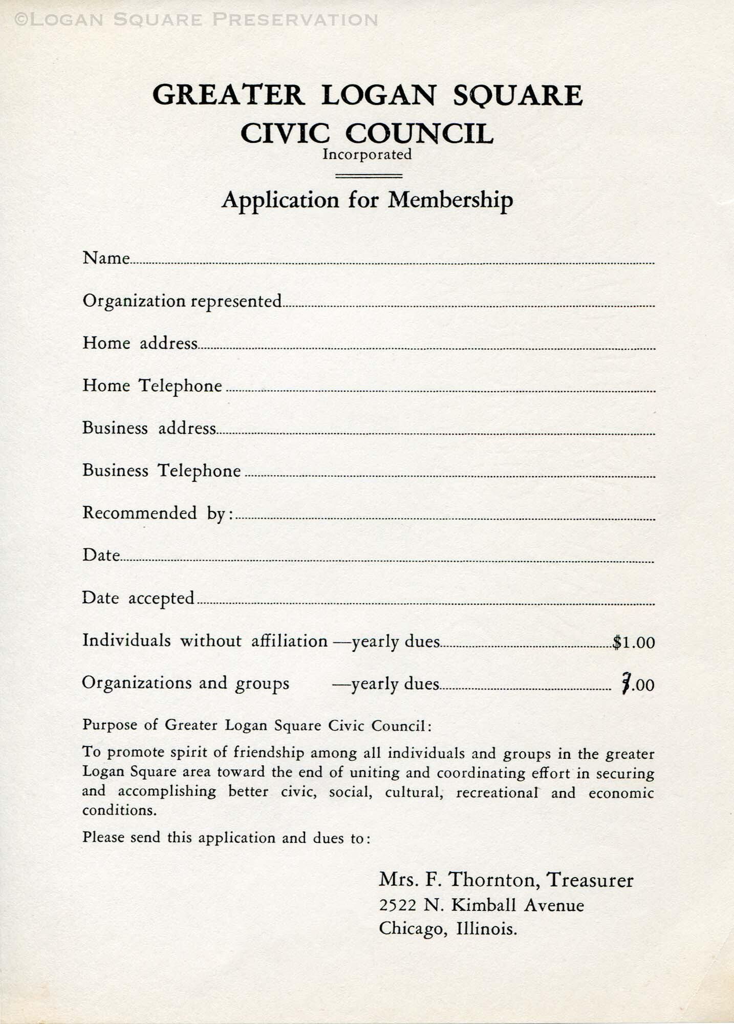 Application form for membership in Greater Logan Square Civic Council neighborhood booster group, circa 1940sDimensions