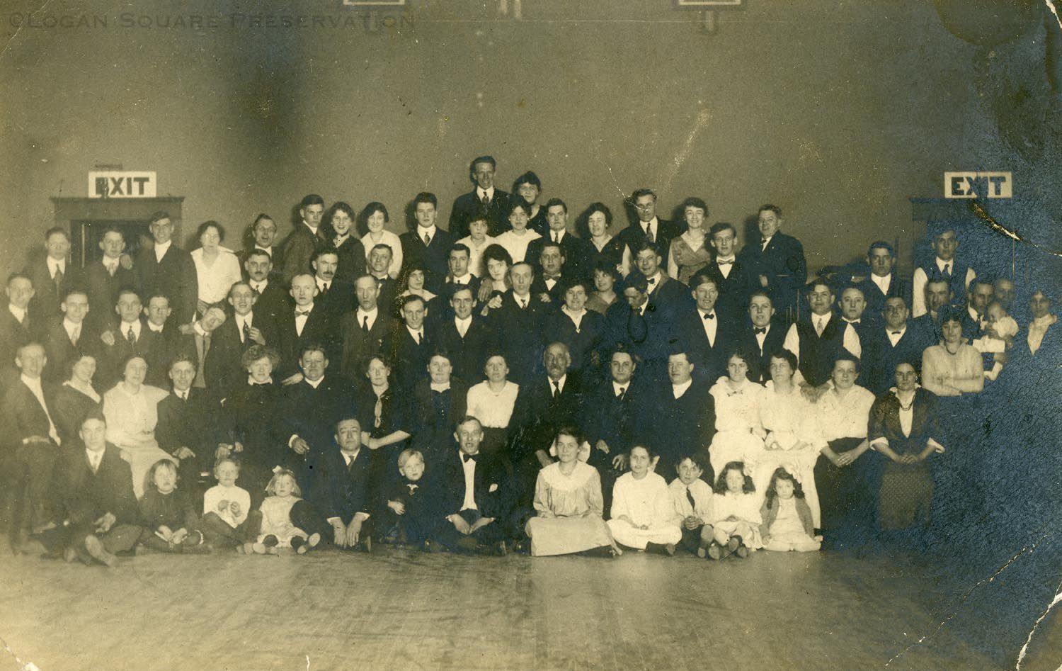 Real-photo postcard portrait of group of men, women and children gathered in upstairs ballroom at Overbeck Hall, circa 1910s-1920sPhotograph Details