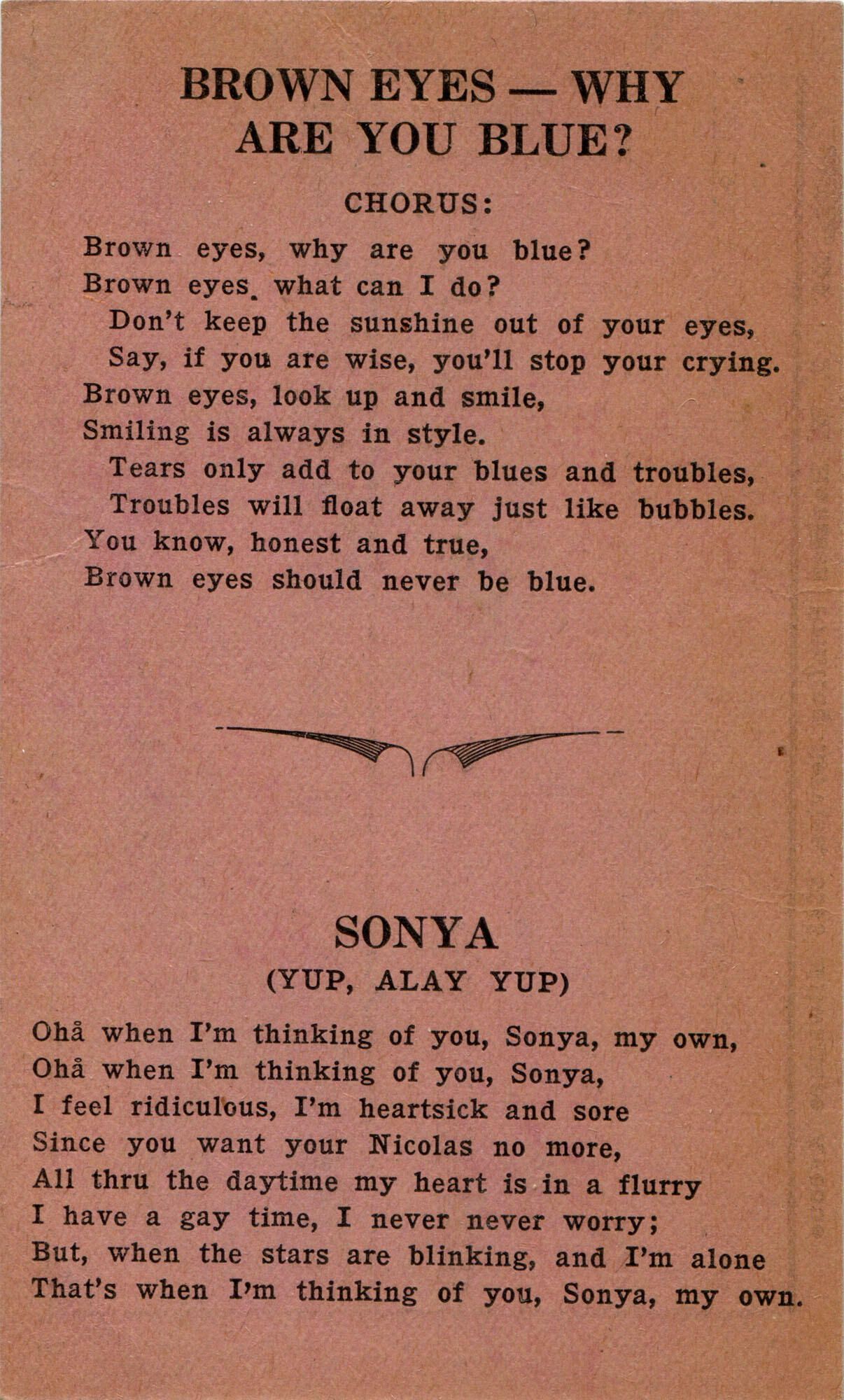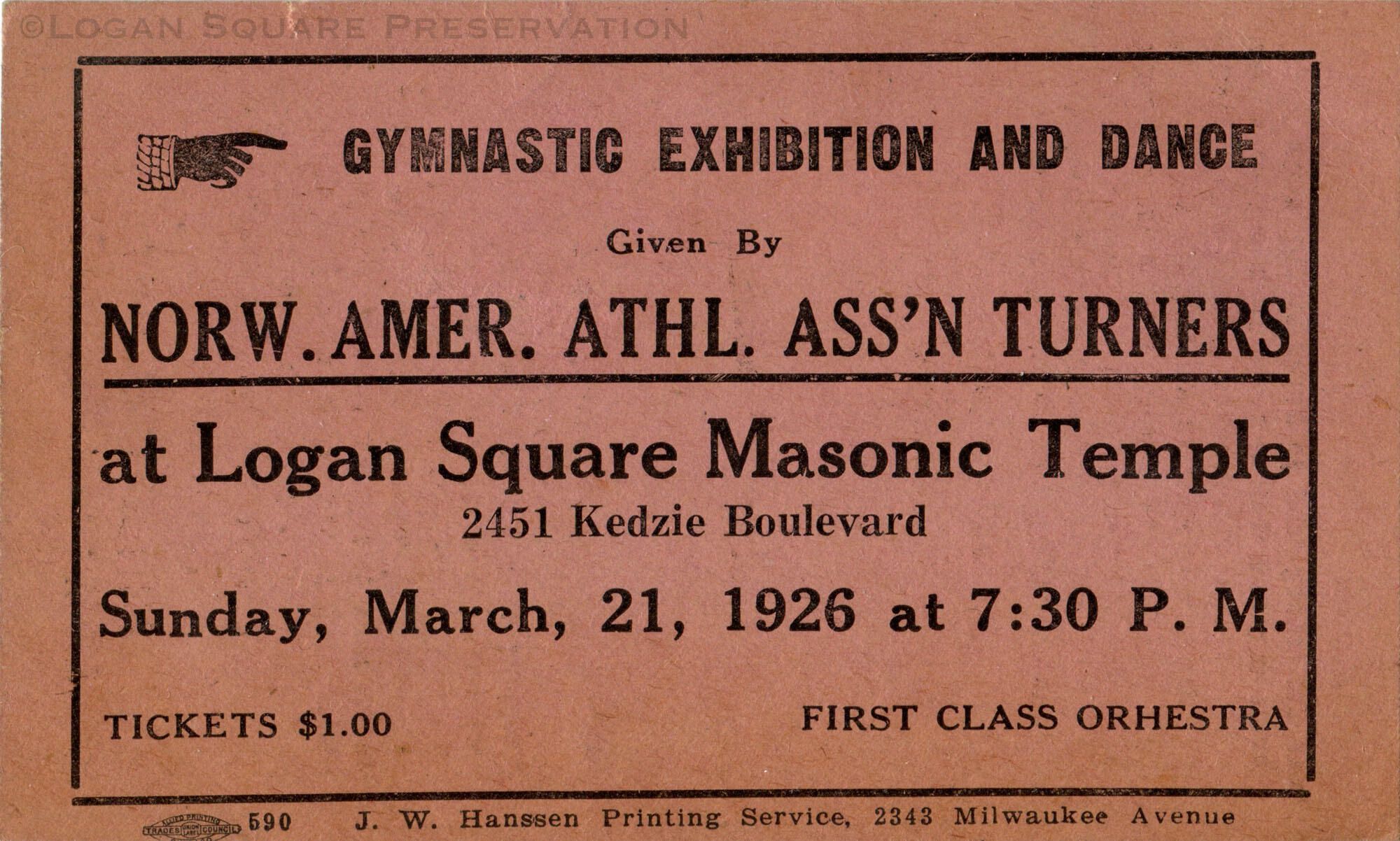 Invitation card to Mar 21, 1926 gymnastic exhibition and dance at Logan Square Masonic Temple given by Norwegian-American Athletic Association Turners. Lyrics to "Brown Eyes - Why Are You Blue?" and "Sonya" on back.Publication Details