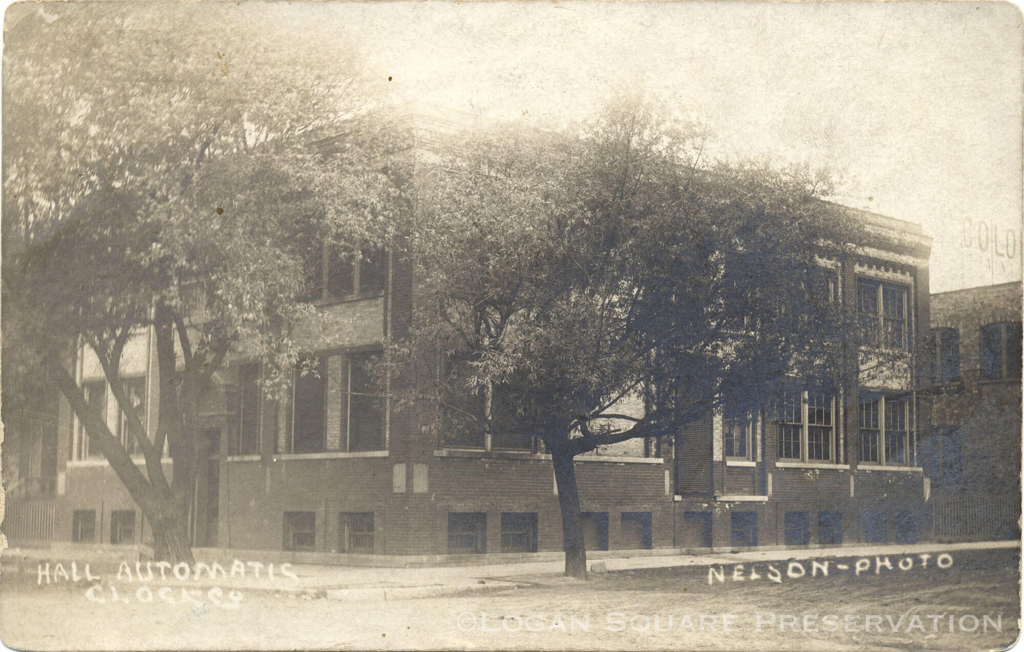 Real-photo postcard view of brick Hahl Automatic Clock Co. factory behind trees at 2644 N Maplewood circa 1910Subject