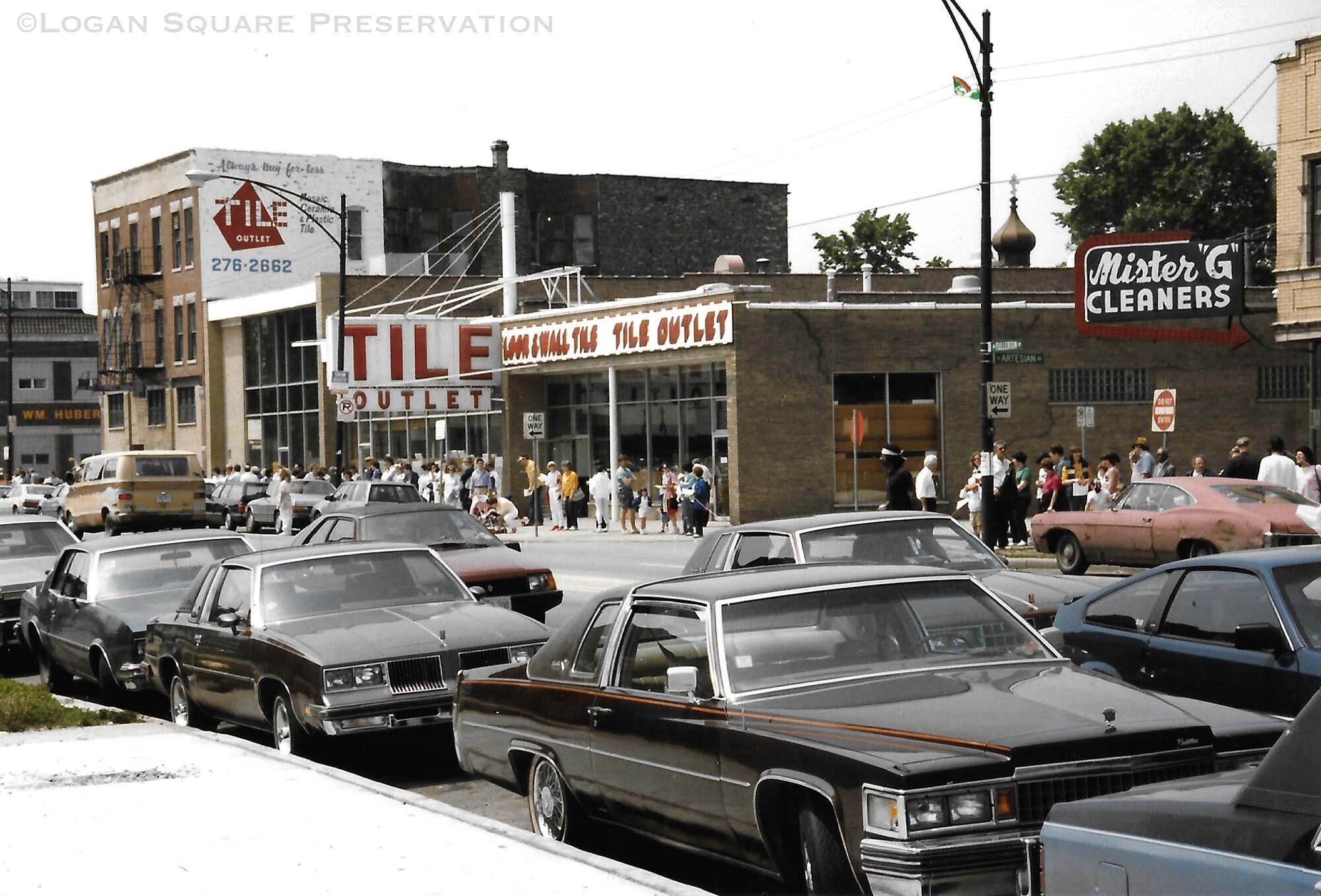 Snapshot photo looking northwest across Fullerton Ave parked cars to neighbors holding hands in line on north sidewalk, May 25, 1986Photograph Details