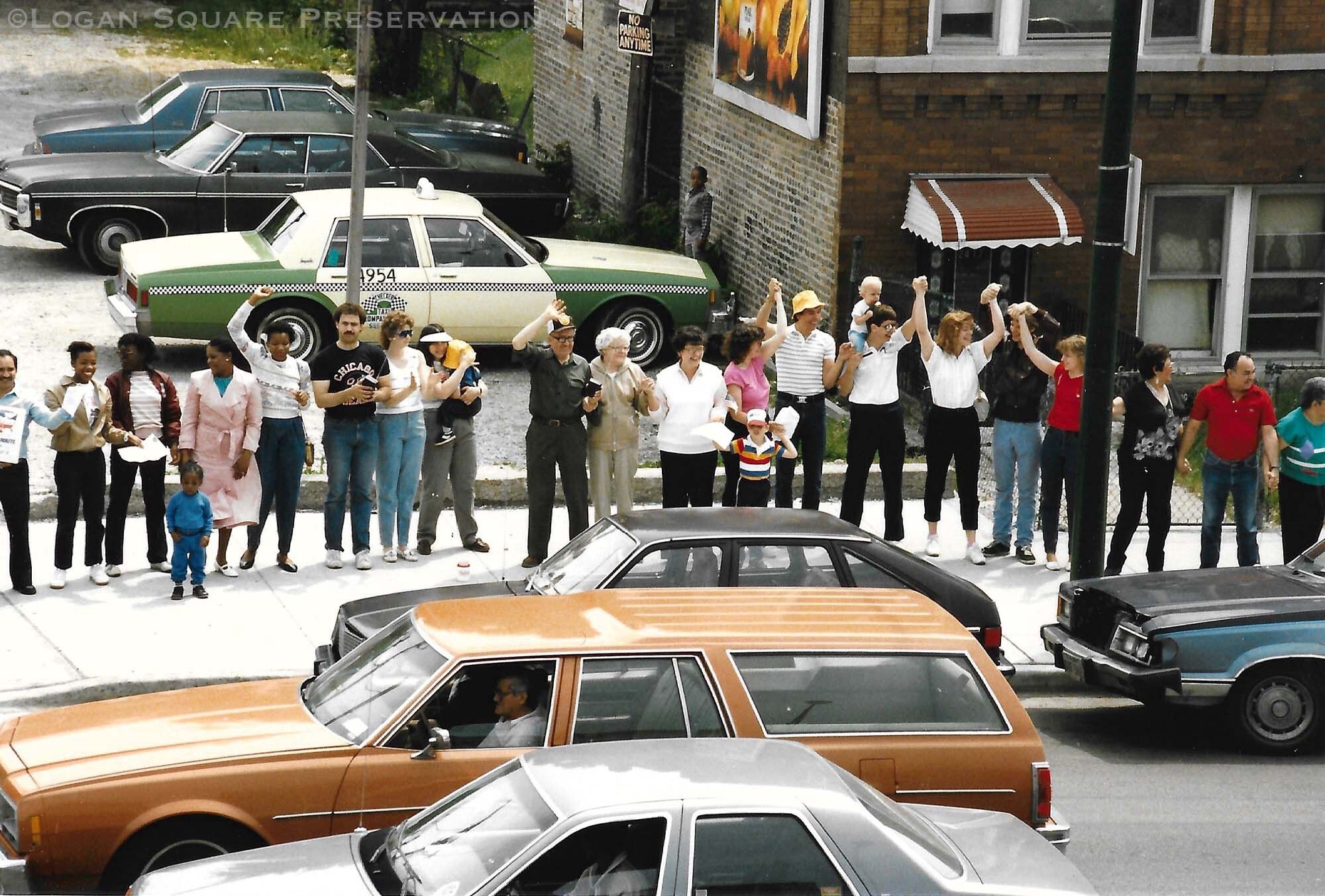 Snapshot photo looking down from second-floor window at line of neighbors holding hands on south sidewalk of Fullerton Ave waving at traffic on street, May 25, 1986Photograph Details