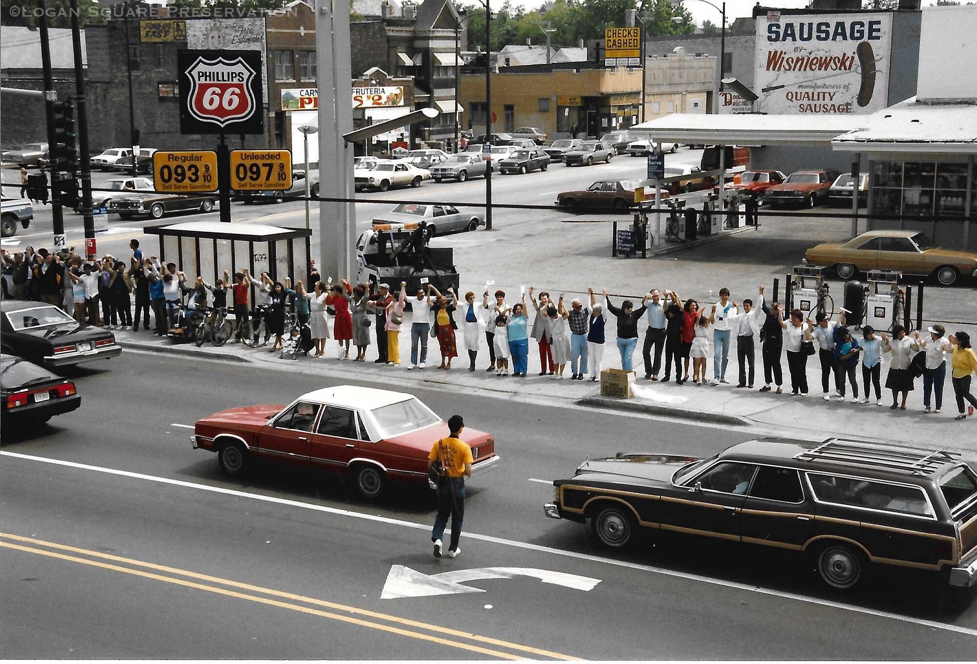 Snapshot photo looking down from second-floor window at line of neighbors holding hands on south sidewalk of Fullerton Ave at Western in front of gas station, and traffic waiting for light, May 25, 1986Photograph Details