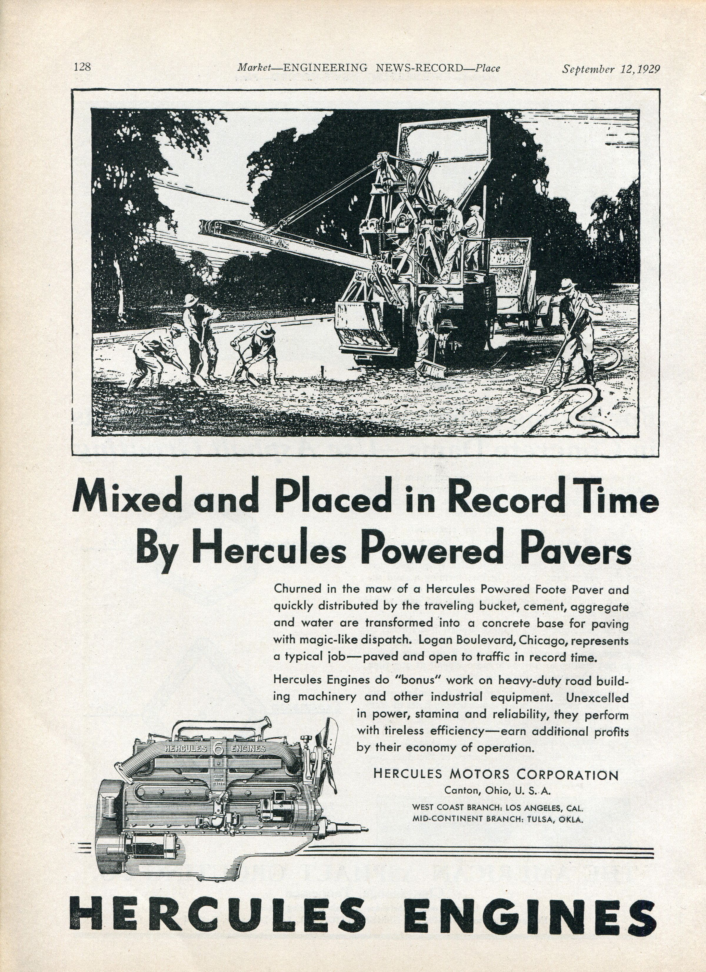 Mixed and Placed in Record Time by Hercules Powered Pavers - page 128 from Sept 12, 1929 Engineering News-RecordPublication Details