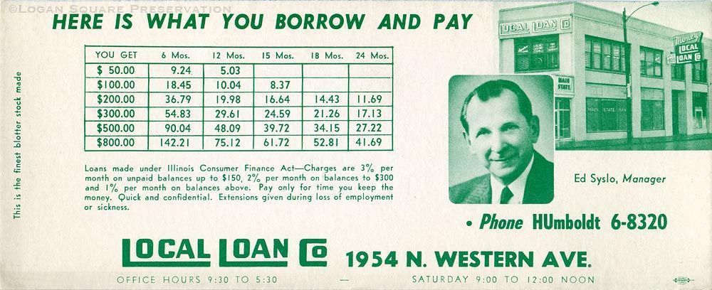 Promotional ink blotter card with advertisement for Local Loan Co. featuring chart of loan rates and inset photos of company office building and manager Ed Syslo, circa 1950sDimensions