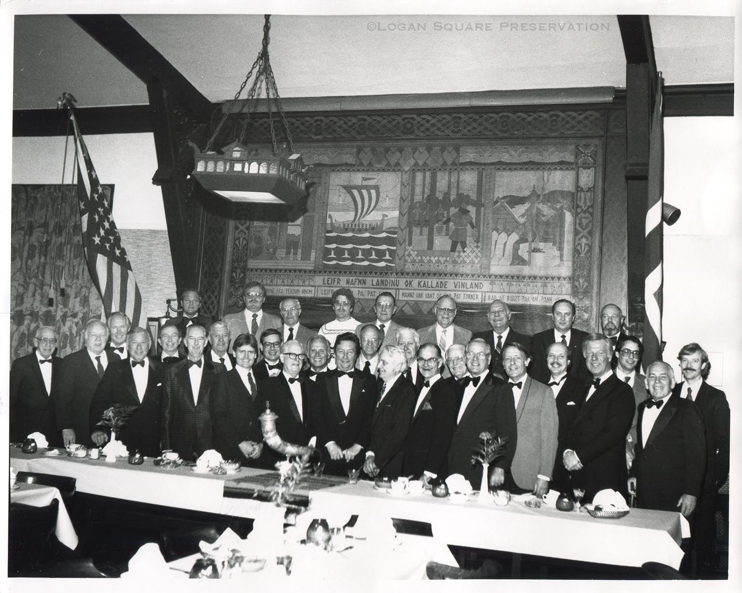 Portrait of dinner guests at Herremiddag "gentleman's dinner" wild game banquet gathered in front of Leif Erickson mural and Dragestil chandelier in ballroom of Norske Klub on Dec 7, 1984Photograph Details