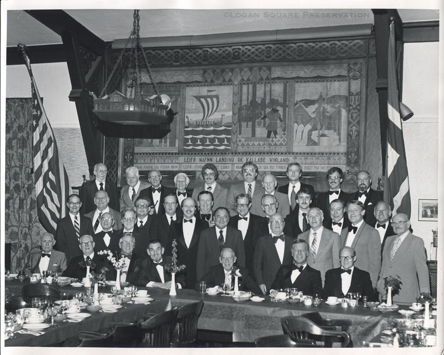 Portrait of dinner guests at Herremiddag "gentleman's dinner" wild game banquet gathered in front of Leif Erickson mural and Dragestil chandelier in ballroom of Norske Klub on first Friday of November, 1981Photograph Details