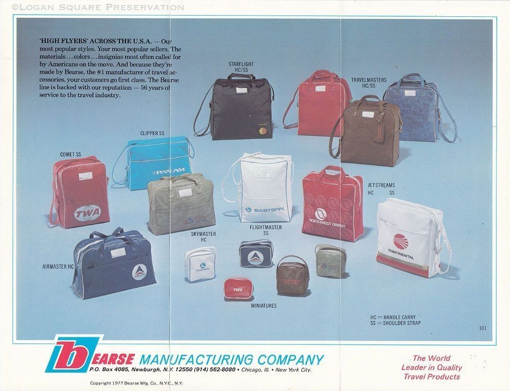 Tri-fold promotional brochure with photo of variety of sizes of airline flight bags made by Bearse Manufacturing Co., 1977Collection