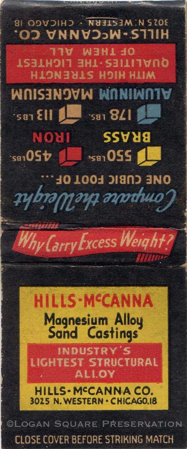1.5" matchbook printed in red, blue and yellow on black background with infographic comparing metal weights on back, circa 1940sPublication Details
