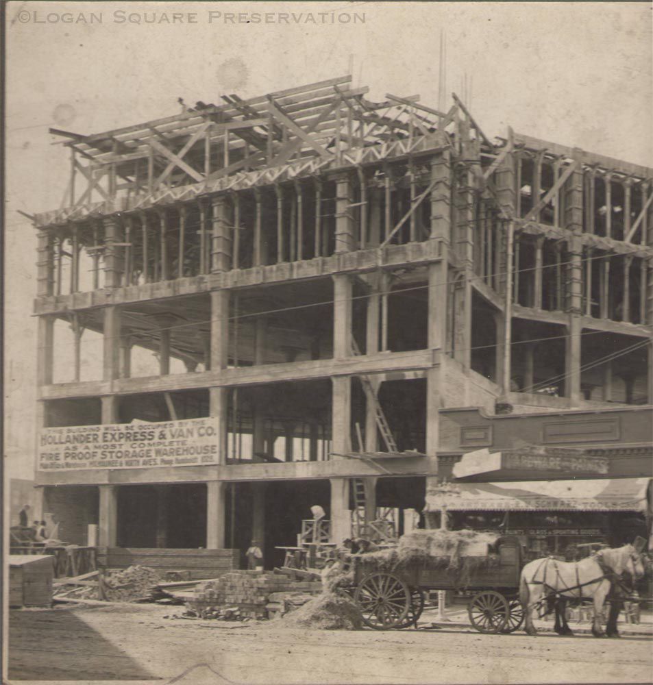 Cropped documentary photograph mounted on card, looking north at Fullerton Ave facade of Hollander storage warehouse under construction with wooden formwork over concrete columns and horse-drawn delivery wagon unloading construction materials in front, likely taken May 9, 1912Photograph Details