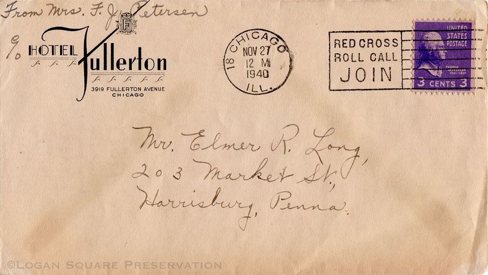 Empty hotel stationery envelope with Hotel Fullerton logo, postmarked Nov 27, 1940 from Mrs. F.J. Peterson to Mr. Elmer R. LongPublication Details