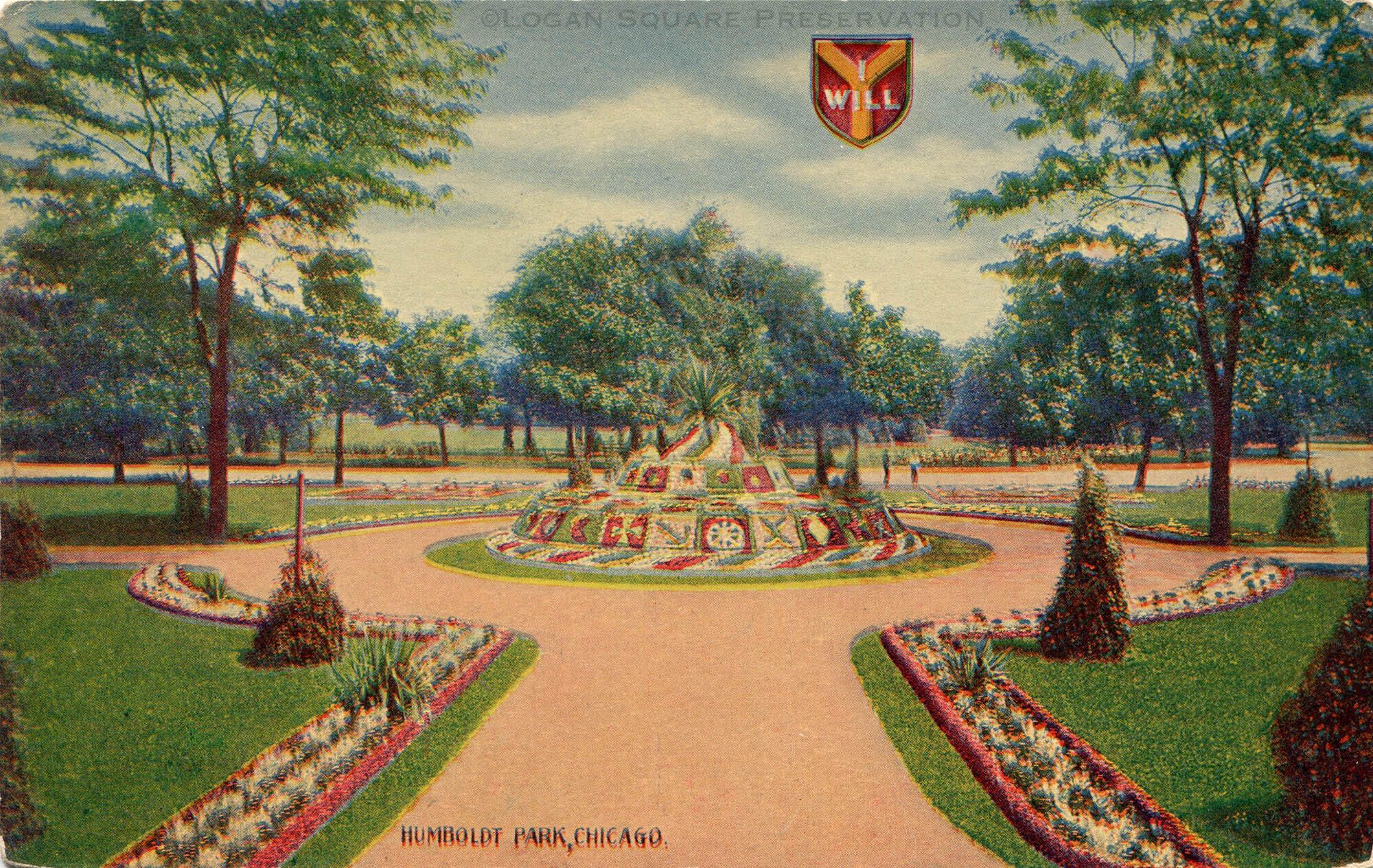 Colored lithograph postcard view of pathway approach to no-longer-extant decorative flower display in Humboldt Park, with graphic of municipal device and city motto "I Will" floating above, circa 1907Subject Place