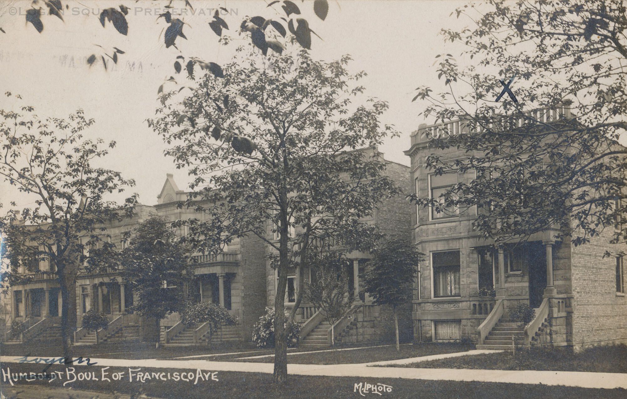 Real-photo postcard view of five greystone apartments at 2843-2855 W. Logan Blvd (formerly Humboldt Blvd), circa 1909Subject