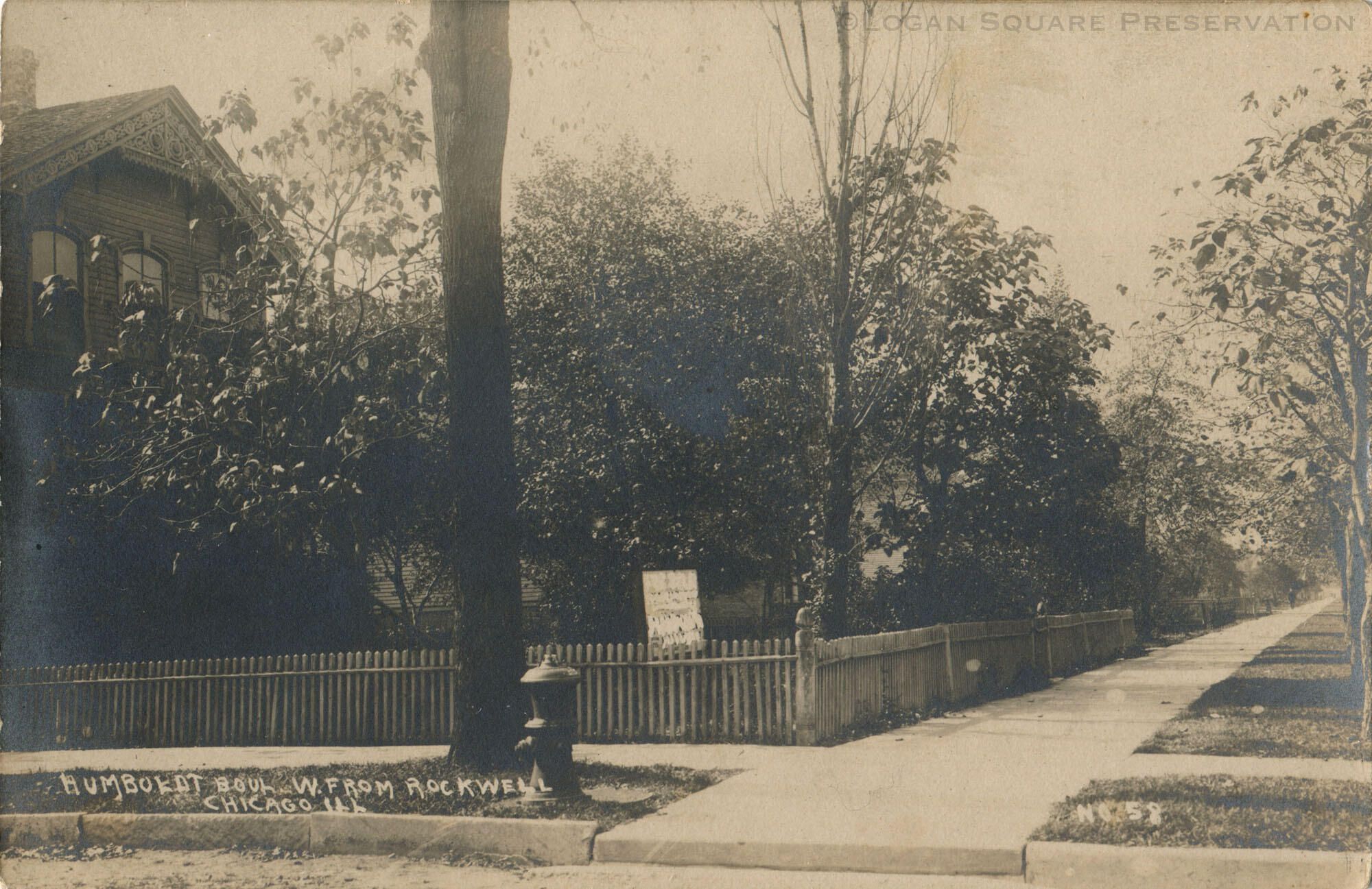 Real-photo postcard view looking west down sidewalk along Logan Boulevard from corner of Rockwell Ave, circa 1910. Circa 1871 frame Whitman house with ornamented bargeboards visible above trees at 2603 W. Logan. Words on For Sale sign behind picket fence have been painted out on negative.Subject Place