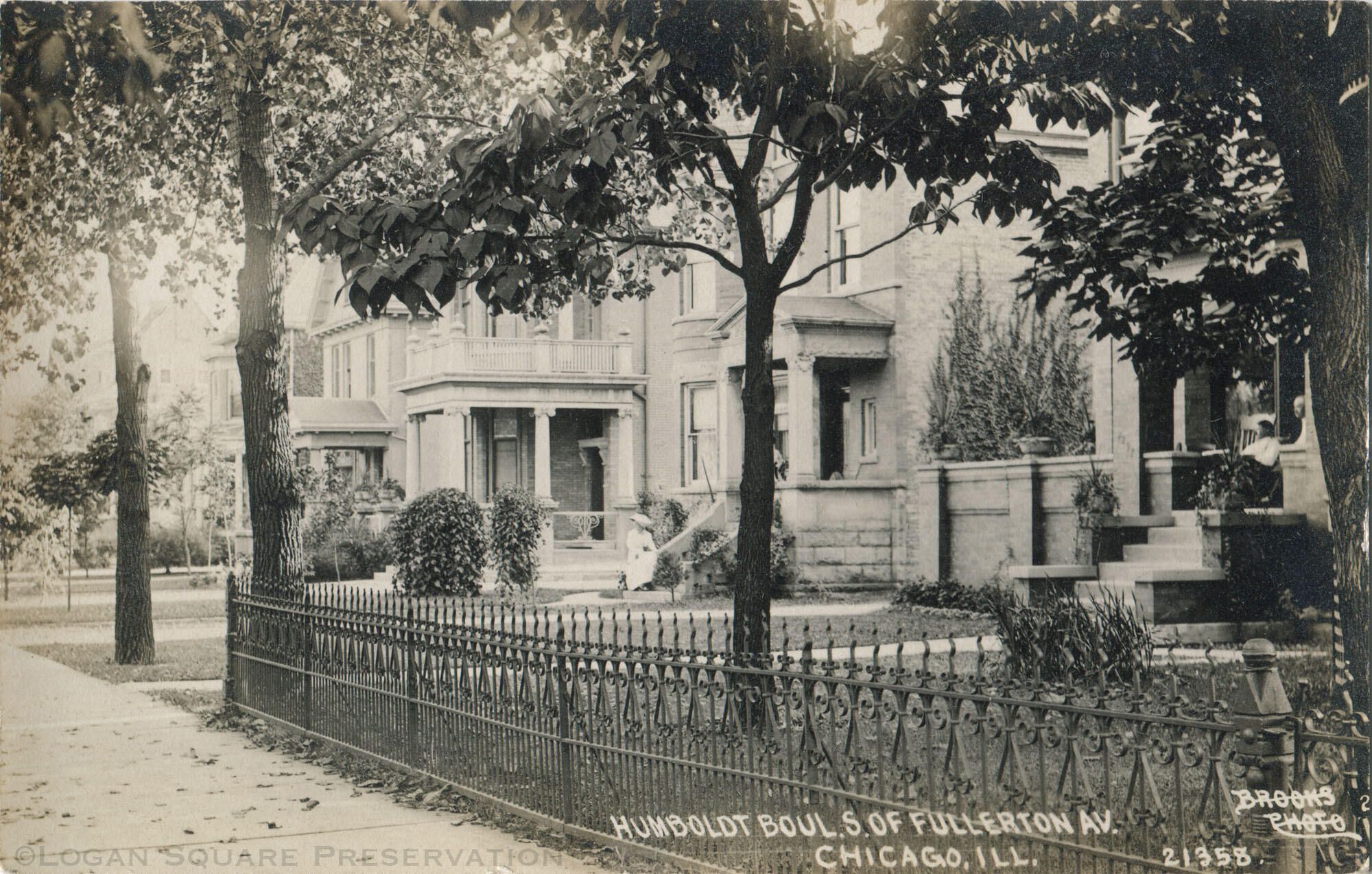 Real-photo postcard view looking south along iron fence at houses along west side of 2300 block of Kedzie Boulevard with people sitting on porches, circa 1910. C.R. Childs reprint #21358 of Brooks Photo postcardSubject